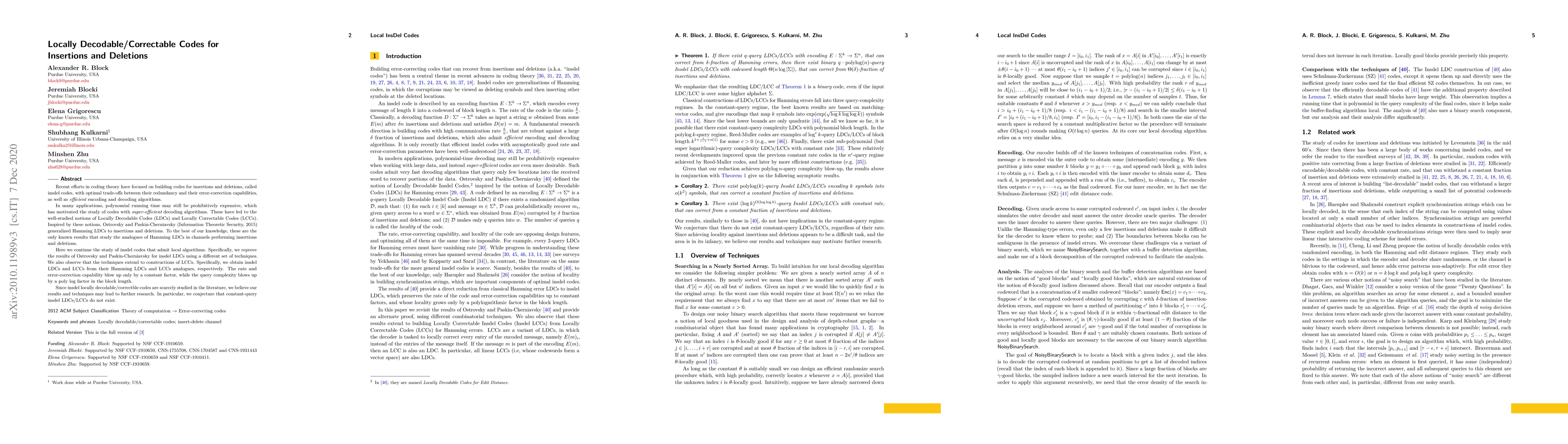 This paper studies locally decodable/correctable codes for insertions and deletions (insdel codes), generalizing prior results from Hamming codes. It reproves existing insdel locally decodable codes using different techniques and extends them to locally correctable variants, maintaining optimal trade-offs and introducing efficient decoding algorithms. The authors conjecture that constant-query insdel locally decodable/correctable codes may not exist.