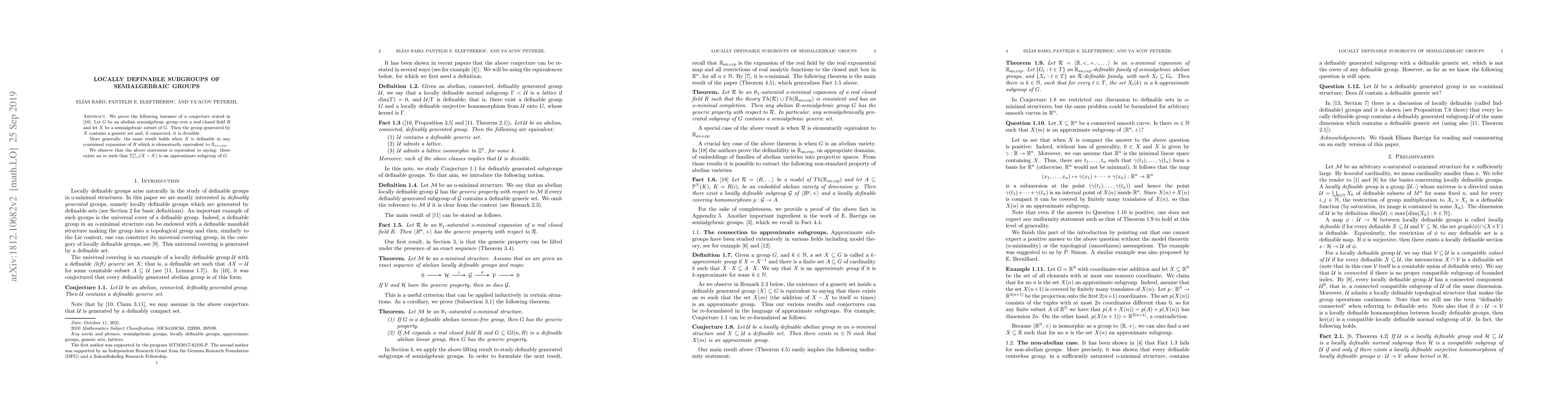 This paper proves a conjecture regarding locally definable subgroups of semialgebraic groups, showing that the group generated by a semialgebraic subset contains a generic set and, if connected, is divisible. The result extends to definable sets in o-minimal expansions equivalent to $\mathbb R_{an,exp}$.
