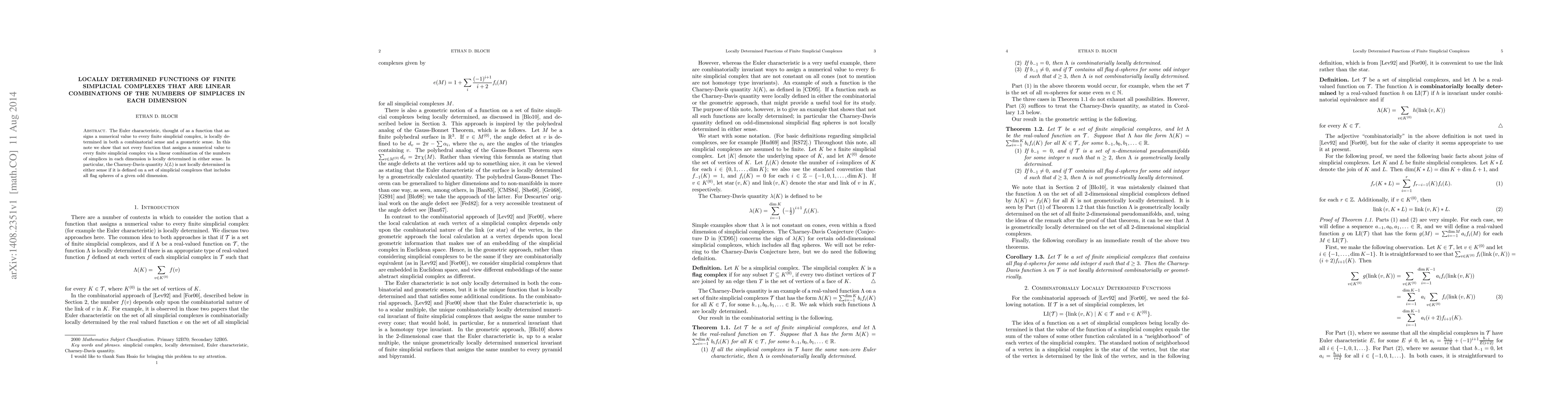 The Euler characteristic, thought of as a function that assigns a numerical value to every finite simplicial complex, is locally determined in both a combinatorial sense and a geometric sense. In this note we show that not every function that assigns a numerical value to every finite simplicial complex via a linear combination of the numbers of simplices in each dimension is locally determined in either sense. In particular, the Charney-Davis quantity $\lambda (L)$ is not locally determined in either sense if it is defined on a set of simplicial complexes that includes all flag spheres of a given odd dimension.