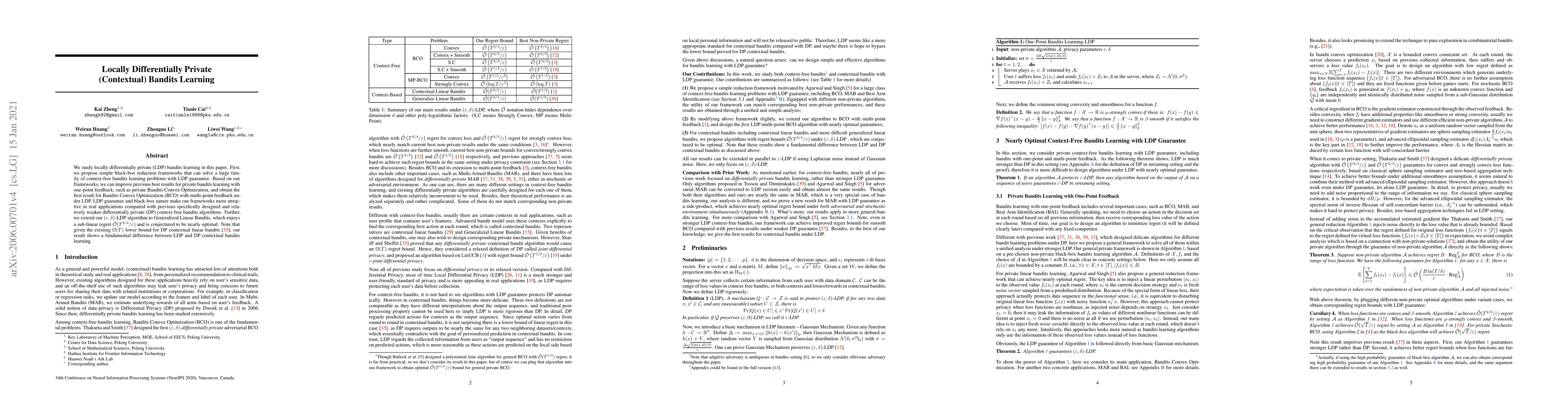 We study locally differentially private (LDP) bandits learning in this paper. First, we propose simple black-box reduction frameworks that can solve a large family of context-free bandits learning problems with LDP guarantee. Based on our frameworks, we can improve previous best results for private bandits learning with one-point feedback, such as private Bandits Convex Optimization, and obtain the first result for Bandits Convex Optimization (BCO) with multi-point feedback under LDP. LDP guarantee and black-box nature make our frameworks more attractive in real applications compared with previous specifically designed and relatively weaker differentially private (DP) context-free bandits algorithms. Further, we extend our $(\varepsilon, \delta)$-LDP algorithm to Generalized Linear Bandits, which enjoys a sub-linear regret $\tilde{O}(T^{3/4}/\varepsilon)$ and is conjectured to be nearly optimal. Note that given the existing $\Omega(T)$ lower bound for DP contextual linear bandits (Shariff & Sheffe, 2018), our result shows a fundamental difference between LDP and DP contextual bandits learning.