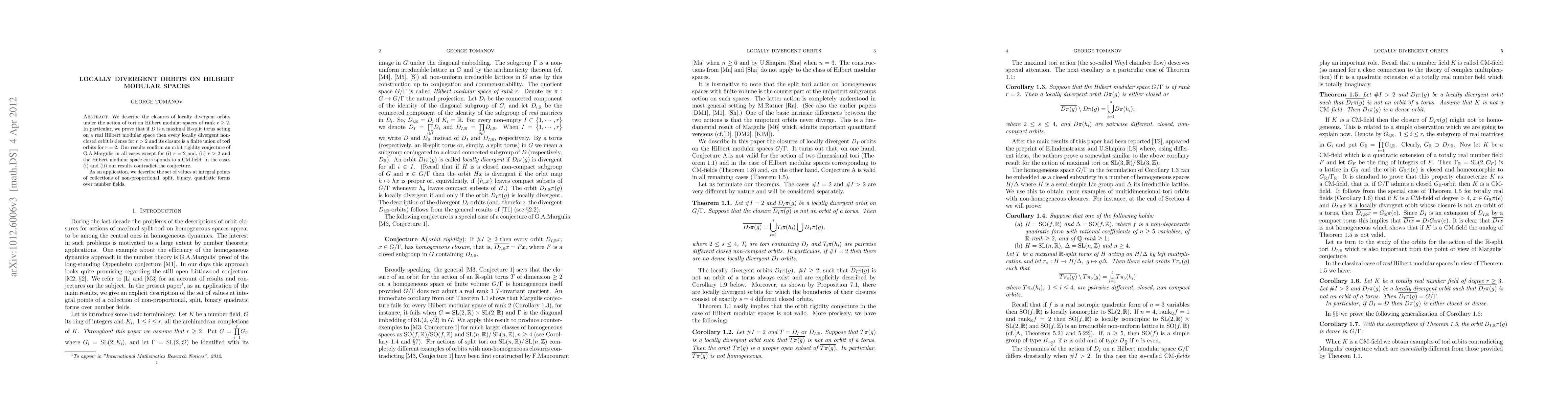We describe the closures of locally divergent orbitsunder the action of tori on Hilbert modular spaces of rank r = 2. In particular, we prove that if D is a maximal R-split torus acting on a real Hilbert modular space then every locally divergent non-closed orbit is dense for r > 2 and its closure is a finite union of tori orbits for r = 2. Our results confirm an orbit rigidity conjecture of Margulis in all cases except for (i) r = 2 and, (ii) r > 2 and the Hilbert modular space corresponds to a CM-field; in the cases (i) and (ii) our results contradict the conjecture. As an application, we describe the set of values at integral points of collections of non-proportional, split, binary, quadratic forms over number fields.