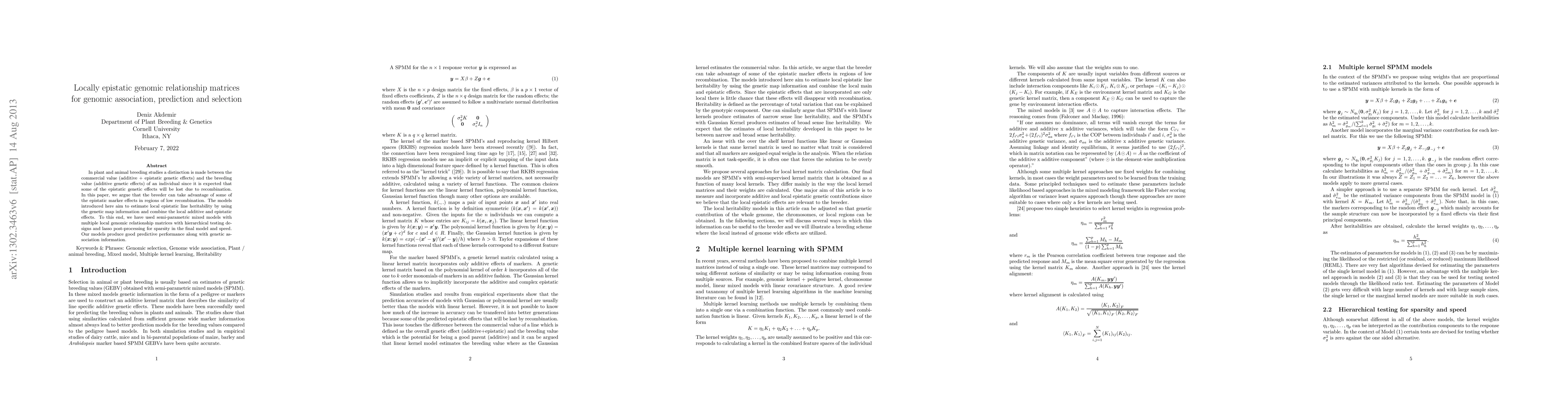 As the amount and complexity of genetic information increases it is necessary that we explore some efficient ways of handling these data. This study takes the "divide and conquer" approach for analyzing high dimensional genomic data. Our aims include reducing the dimensionality of the problem that has to be dealt one at a time, improving the performance and interpretability of the models. We propose using the inherent structures in the genome; to divide the bigger problem into manageable parts. In plant and animal breeding studies a distinction is made between the commercial value (additive + epistatic genetic effects) and the breeding value (additive genetic effects) of an individual since it is expected that some of the epistatic genetic effects will be lost due to recombination. In this paper, we argue that the breeder can take advantage of some of the epistatic marker effects in regions of low recombination. The models introduced here aim to estimate local epistatic line heritability by using the genetic map information and combine the local additive and epistatic effects. To this end, we have used semi-parametric mixed models with multiple local genomic relationship matrices with hierarchical testing designs and lasso post-processing for sparsity in the final model and speed. Our models produce good predictive performance along with genetic association information.