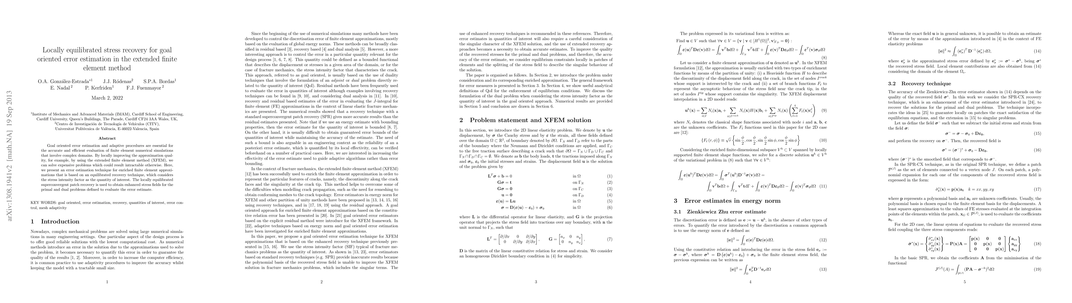 This paper proposes an error estimation technique for the extended finite element method using locally equilibrated stress recovery, focusing on improving approximation quality and enabling the solution of otherwise intractable problems through enhanced stress fields for both primal and dual problems.