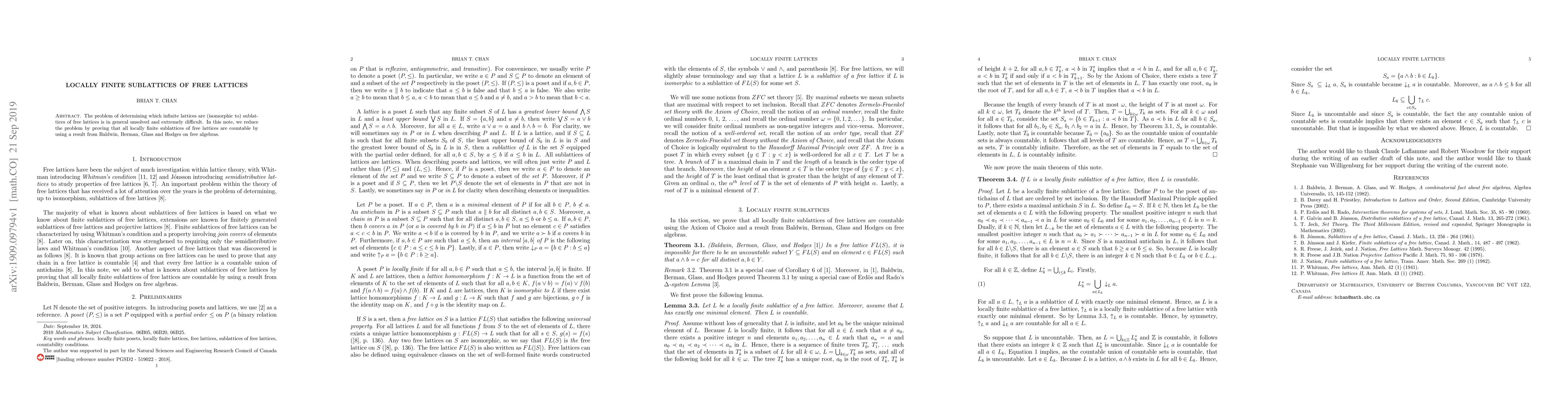Summary: This paper proves that all locally finite sublattices of free lattices are countable, leveraging a result from Baldwin, Berman, Glass, and Hodges on free algebras to address a longstanding unsolved problem in lattice theory.