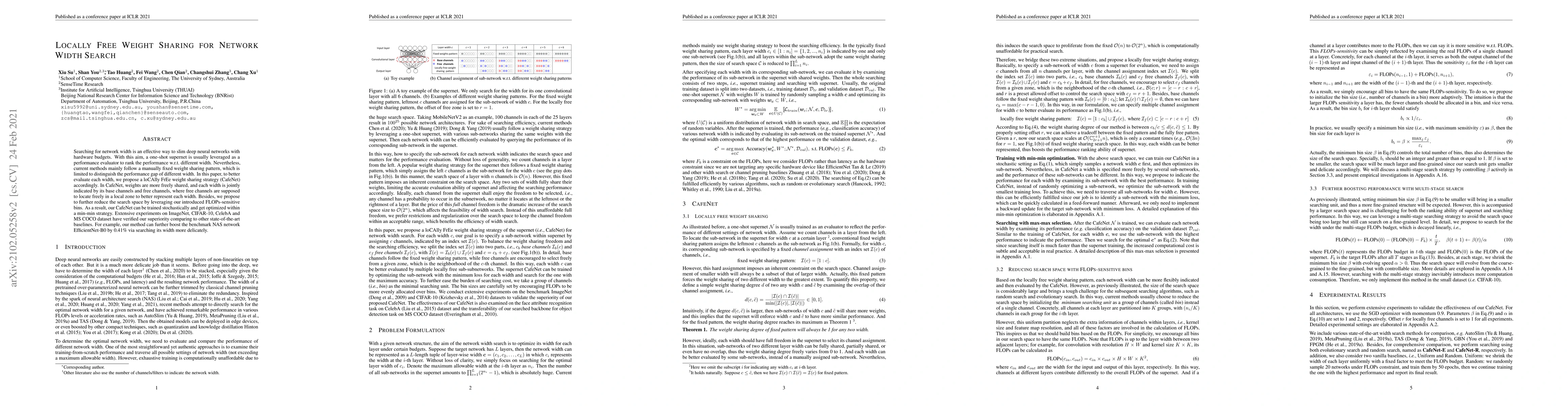 Searching for network width is an effective way to slim deep neural networks with hardware budgets. With this aim, a one-shot supernet is usually leveraged as a performance evaluator to rank the performance \wrt~different width. Nevertheless, current methods mainly follow a manually fixed weight sharing pattern, which is limited to distinguish the performance gap of different width. In this paper, to better evaluate each width, we propose a locally free weight sharing strategy (CafeNet) accordingly. In CafeNet, weights are more freely shared, and each width is jointly indicated by its base channels and free channels, where free channels are supposed to loCAte FrEely in a local zone to better represent each width. Besides, we propose to further reduce the search space by leveraging our introduced FLOPs-sensitive bins. As a result, our CafeNet can be trained stochastically and get optimized within a min-min strategy. Extensive experiments on ImageNet, CIFAR-10, CelebA and MS COCO dataset have verified our superiority comparing to other state-of-the-art baselines. For example, our method can further boost the benchmark NAS network EfficientNet-B0 by 0.41\% via searching its width more delicately.