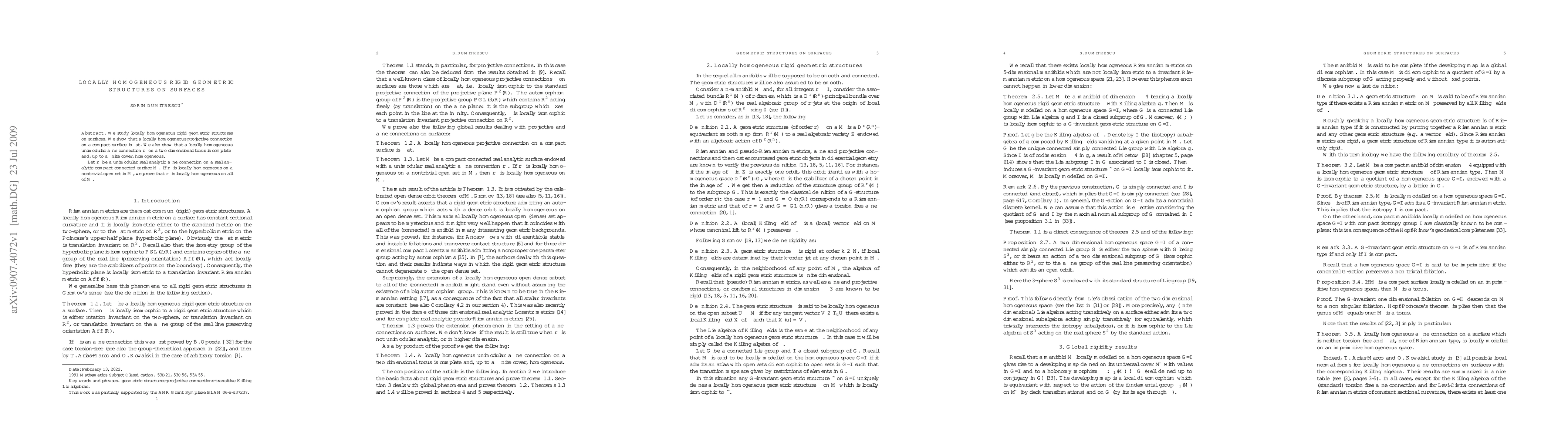 This paper investigates locally homogeneous rigid geometric structures on surfaces, proving that a locally homogeneous projective connection on a compact surface is flat and that a locally homogeneous unimodular affine connection on a two-dimensional torus is complete and homogeneous up to a finite cover. It also establishes that any unimodular real analytic affine connection on a compact connected surface that is locally homogeneous on a nontrivial open set is globally locally homogeneous.