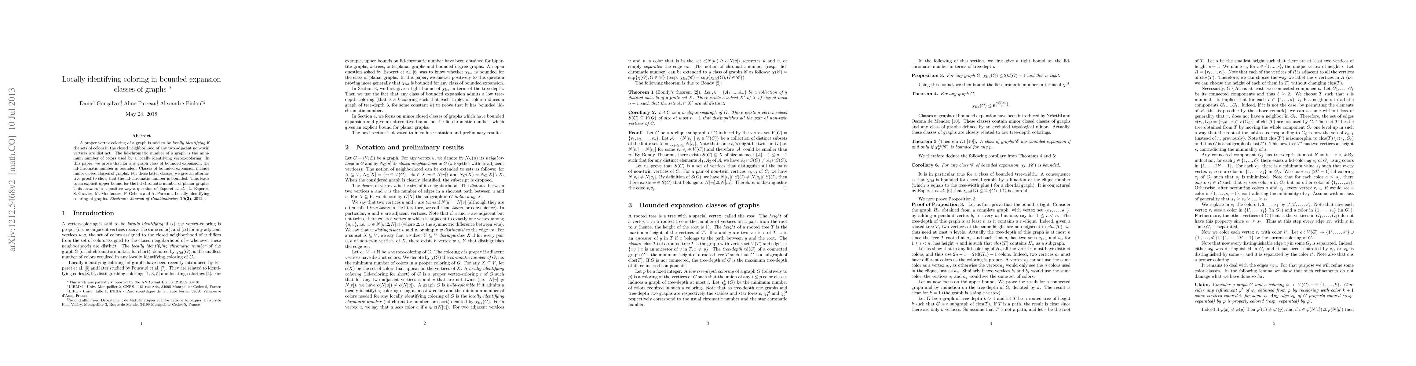 A proper vertex coloring of a graph is said to be locally identifying if the sets of colors in the closed neighborhood of any two adjacent non-twin vertices are distinct. The lid-chromatic number of a graph is the minimum number of colors used by a locally identifying vertex-coloring. In this paper, we prove that for any graph class of bounded expansion, the lid-chromatic number is bounded. Classes of bounded expansion include minor closed classes of graphs. For these latter classes, we give an alternative proof to show that the lid-chromatic number is bounded. This leads to an explicit upper bound for the lid-chromatic number of planar graphs. This answers in a positive way a question of Esperet et al [L. Esperet, S. Gravier, M. Montassier, P. Ochem and A. Parreau. Locally identifying coloring of graphs. Electronic Journal of Combinatorics, 19(2), 2012.].