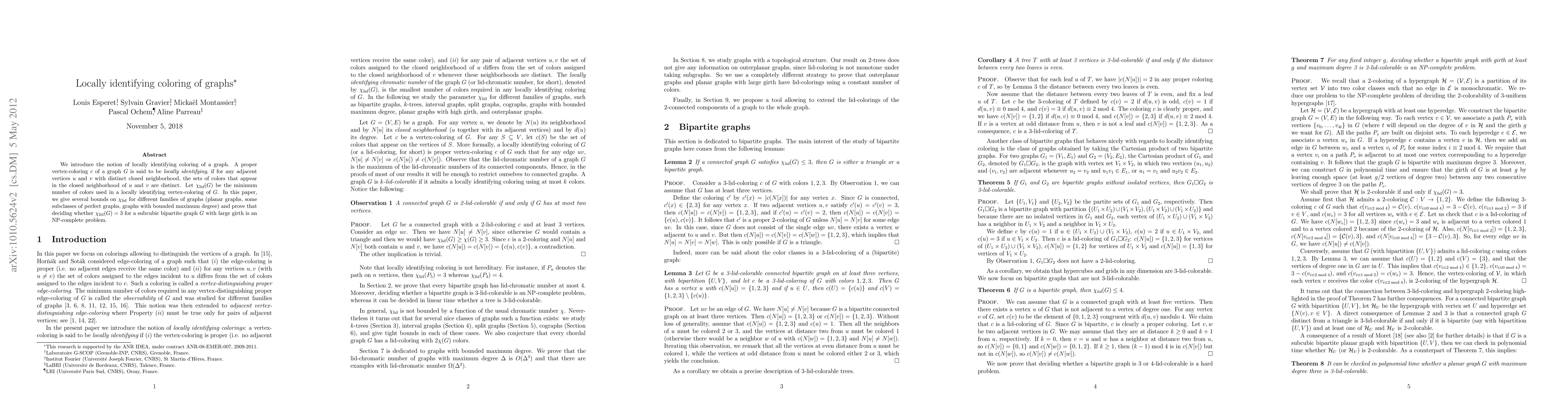 This paper introduces locally identifying coloring for graphs, where a vertex-coloring distinguishes adjacent vertices with distinct closed neighborhoods. The authors provide bounds for $\chi_{lid}$ across various graph families and prove the NP-completeness of determining $\chi_{lid}$ for subcubic bipartite graphs with large girth.