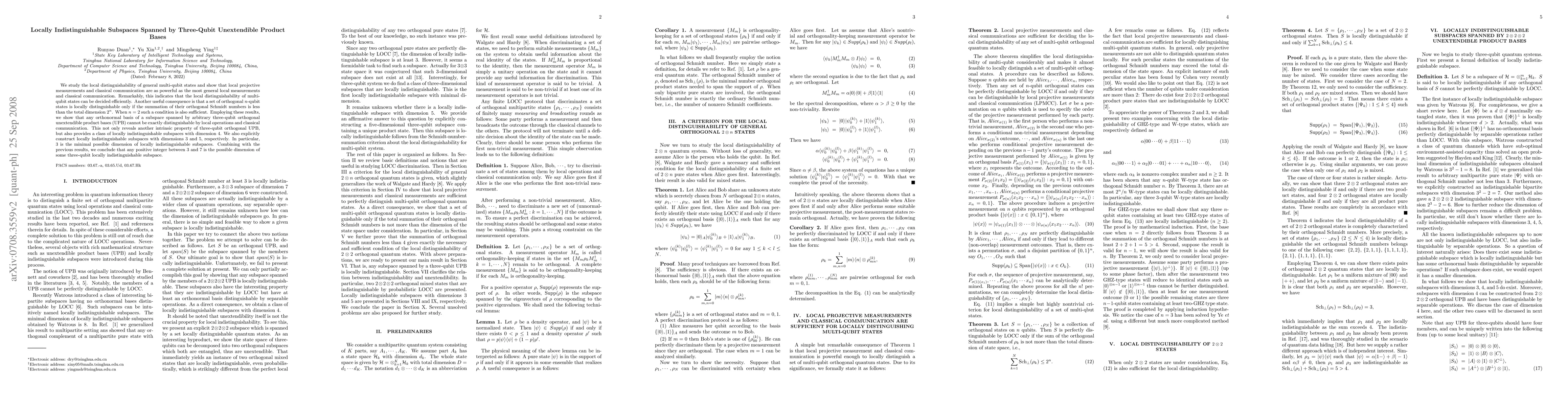 This paper investigates the local distinguishability of three-qubit unextendible product bases (UPB) and finds that local operations and classical communication cannot distinguish orthonormal bases of these subspaces. It concludes that any integer between 3 and 7 can be the dimension of a three-qubit locally indistinguishable subspace.