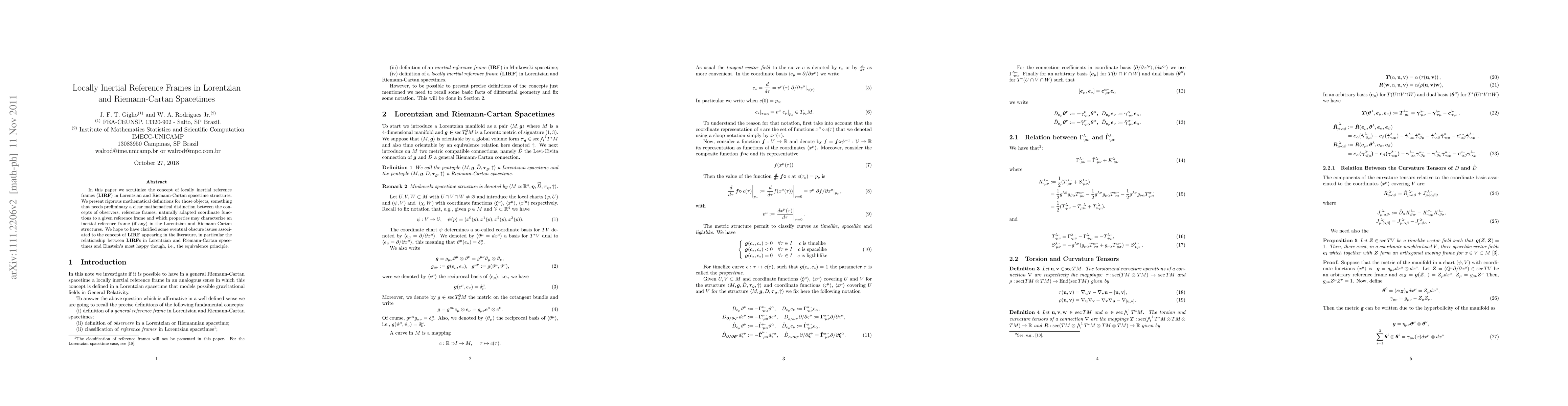 This paper rigorously defines locally inertial reference frames (LIRF) in Lorentzian and Riemann-Cartan spacetimes, clarifying their properties and relationships, particularly in relation to the equivalence principle and distinguishing them from observers and coordinate systems.