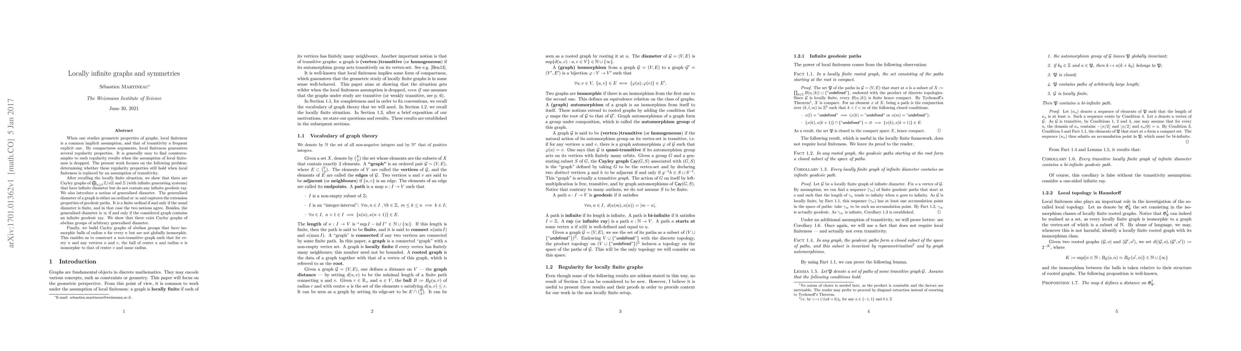 When one studies geometric properties of graphs, local finiteness is a common implicit assumption, and that of transitivity a frequent explicit one. By compactness arguments, local finiteness guarantees several regularity properties. It is generally easy to find counterexamples to such regularity results when the assumption of local finiteness is dropped. The present work focuses on the following problem: determining whether these regularity properties still hold when local finiteness is replaced by an assumption of transitivity. After recalling the locally finite situation, we show that there are Cayley graphs with infinite generating systems that have infinite diameter but do not contain any infinite geodesic ray. We also introduce a notion of generalised diameter. The generalised diameter of a graph is either an ordinal or "truly infinite" and captures the extension properties of geodesic paths. It is a finite ordinal if and only if the usual diameter is finite, and in that case the two notions agree. Besides, the generalised diameter is "truly infinite" if and only if the considered graph contains an infinite geodesic ray. We show that there exist Cayley graphs of abelian groups of arbitrary generalised diameter. Finally, we build Cayley graphs of abelian groups that have isomorphic balls of radius R for every R but are not globally isomorphic. This enables us to construct a non-transitive graph such that for every R and any vertices u and v, the ball of centre u and radius R is isomorphic to that of centre v and same radius.