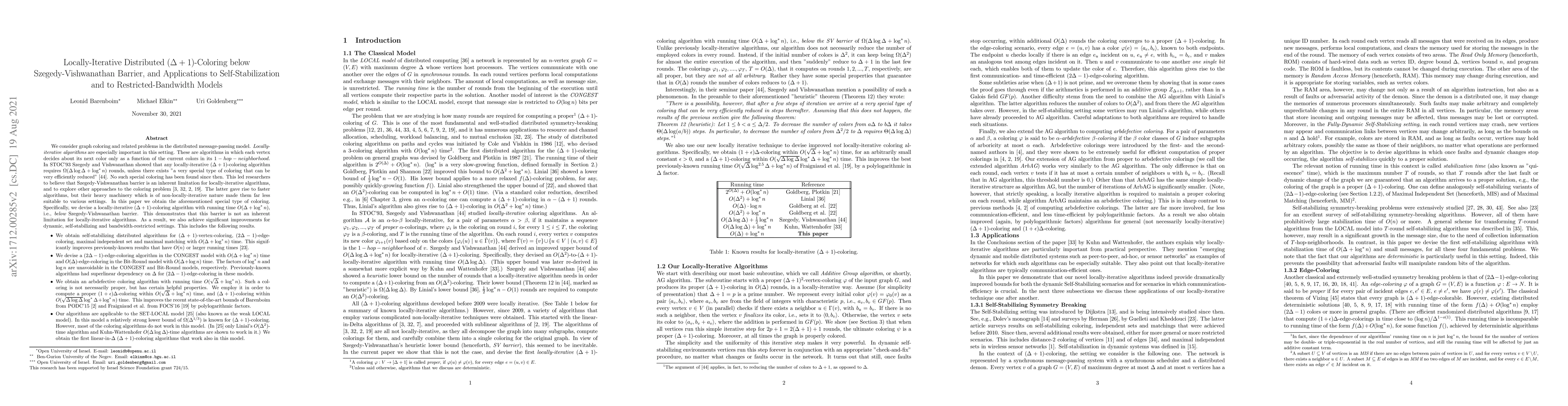 This paper presents a locally-iterative (Delta+1)-coloring algorithm that breaks the Szegedy-Vishwanathan barrier, achieving O(Delta + log^* n) rounds. It also introduces self-stabilizing algorithms for various graph problems and improves edge-coloring algorithms in restricted bandwidth models.