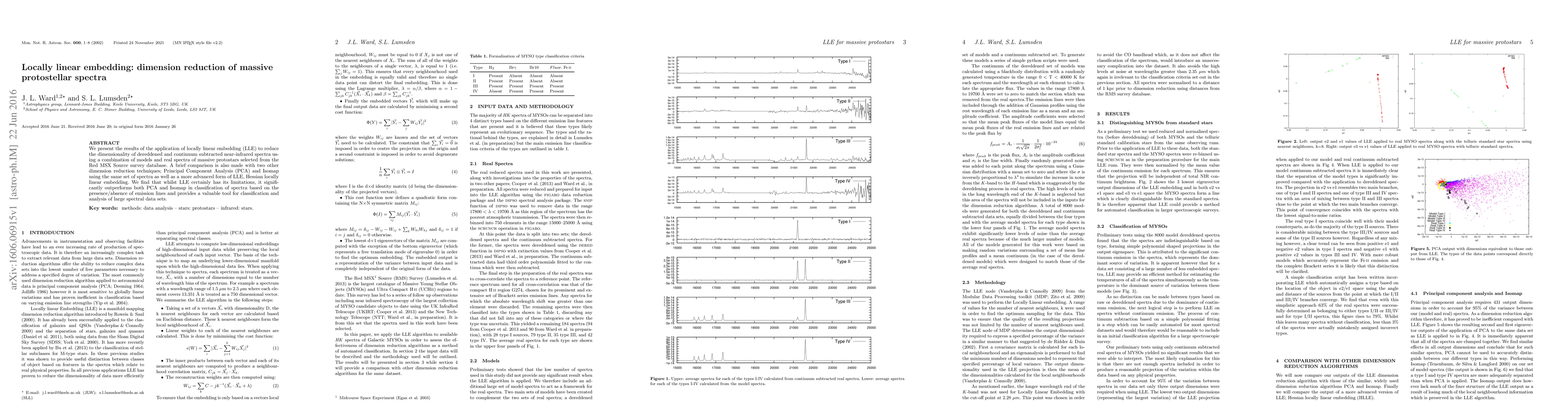 This paper applies locally linear embedding (LLE) to reduce the dimensionality of near-infrared spectra of massive protostars, demonstrating its superior performance over PCA and Isomap in classifying spectra based on emission lines, despite LLE's limitations. The study also compares LLE with an advanced form, Hessian LLE.