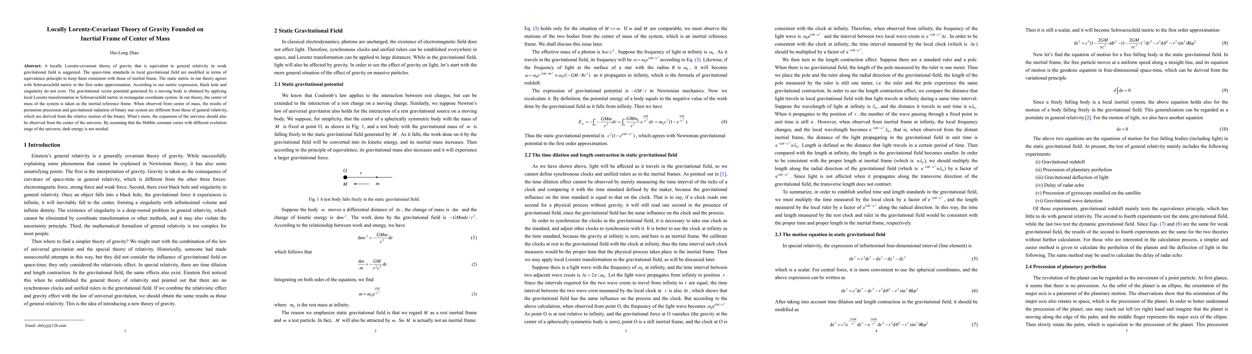 A locally Lorentz-covariant theory of gravity that is equivalent to general relativity in weak gravitational field is suggested. The space-time standards in local gravitational field are modified in terms of equivalence principle to keep them consistent with those of inertial frame. The static metric in our theory agrees with Schwarzschild metric to the first order approximation. According to our metric expression, black hole and singularity do not exist. The gravitational vector potential generated by a moving body is obtained by applying local Lorentz transformation to Schwarzschild metric in rectangular coordinate system. In our theory, the center of mass of the system is taken as the inertial reference frame. When observed from center of mass, the results of periastron precession and gravitational radiation of binary star system are different from those of general relativity, which are derived from the relative motion of the binary. What's more, the expansion of the universe should also be observed from the center of the universe. By assuming that the Hubble constant varies with different evolution stage of the universe, dark energy is not needed.