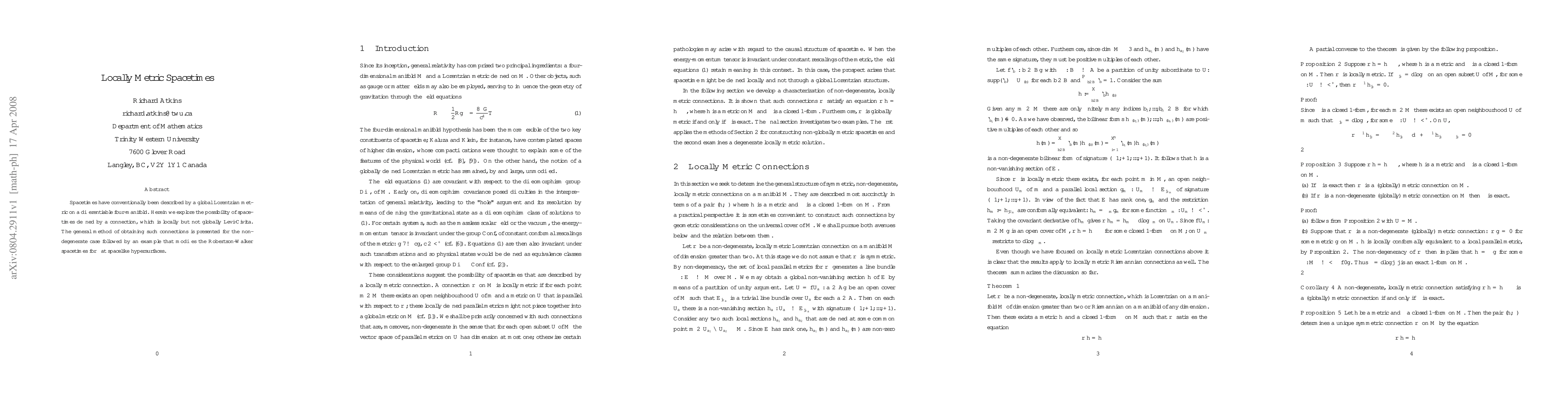 Spacetimes have conventionally been described by a global Lorentzian metric on a differentiable four-manifold. Herein we explore the possibility of spacetimes defined by a connection, which is locally but not globally Levi-Civita. The general method of obtaining such connections is presented for the non-degenerate case followed by an example that modifies the Robertson-Walker spacetimes for flat spacelike hypersurfaces.