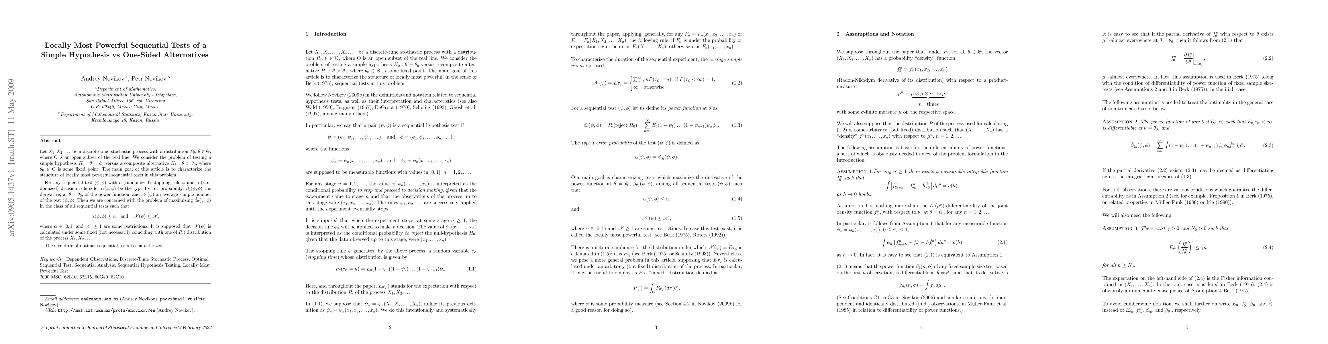 This paper investigates the structure of locally most powerful sequential tests for a simple null hypothesis versus a one-sided alternative in a stochastic process. It characterizes the optimal tests that maximize power while controlling type I error and average sample number under specified constraints.