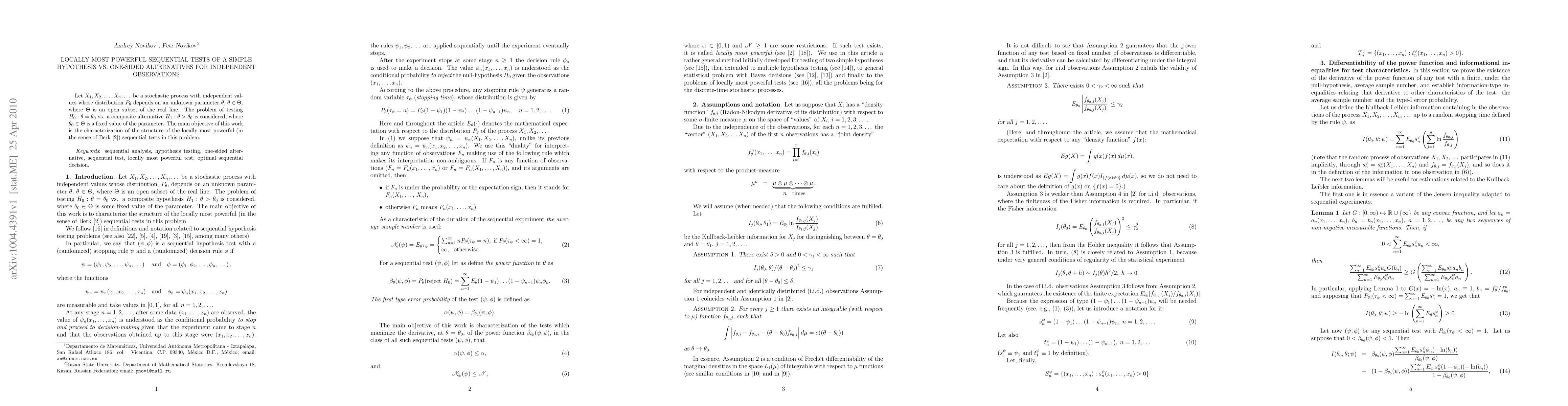 This paper explores the structure of locally most powerful sequential tests for testing a simple null hypothesis $H_0: \theta=\theta_0$ against a one-sided alternative $H_1: \theta>\theta_0$ in a stochastic process with independent observations. The focus is on characterizing the optimal sequential testing strategy.