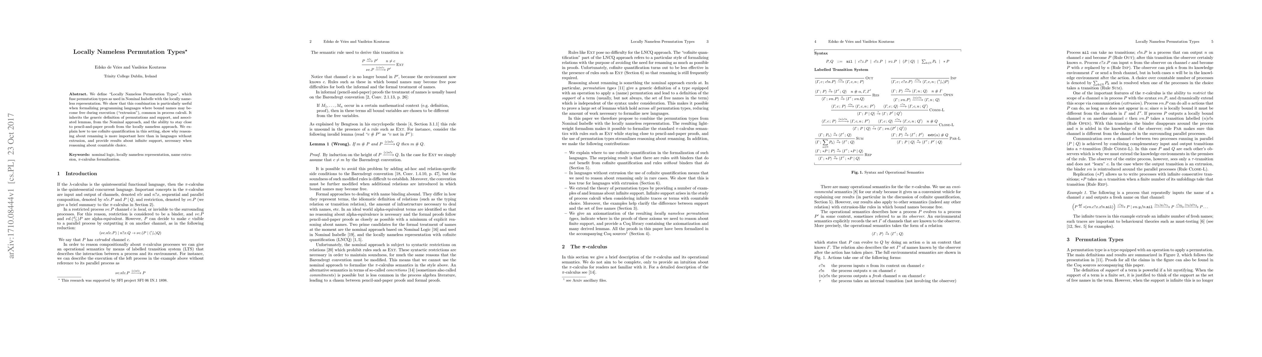 This paper introduces "Locally Nameless Permutation Types," combining permutation types from Nominal Isabelle with locally nameless representation, enhancing formalization of programming languages with "extrusion." It leverages generic permutation definitions and cofinite quantification, emphasizing the importance of renaming in reasoning about such languages.