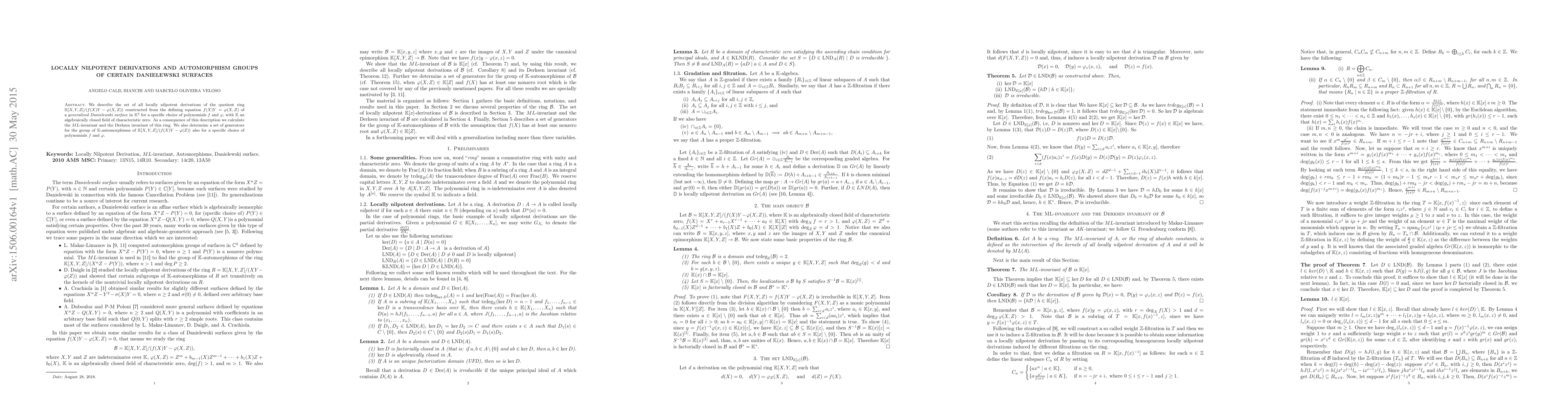 We describe the set of all locally nilpotent derivations of the quotient ring $\mathbb{K}[X,Y,Z]/(f(X)Y - \varphi(X,Z))$ constructed from the defining equation $f(X)Y = \varphi(X,Z)$ of a generalized Danielewski surface in $\mathbb K^3$ for a specific choice of polynomials $f$ and $\varphi$, with $\mathbb K$ an algebraically closed field of characteristic zero. As a consequence of this description we calculate the $ML$-invariant and the Derksen invariant of this ring. We also determine a set of generators for the group of $\mathbb K$-automorphisms of $\mathbb K[X,Y,Z]/(f(X)Y - \varphi(Z))$ also for a specific choice of polynomials $f$ and $\varphi$.