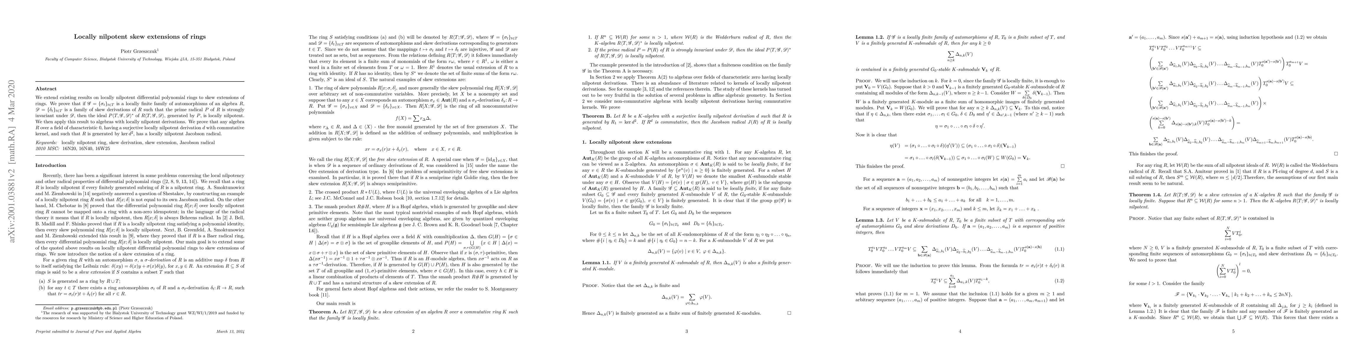 We extend existing results on locally nilpotent differential polynomial rings to skew extensions of rings. We prove that if $\mathscr{G}=\{\sigma_t\}_{t\in T}$ is a locally finite family of automorphisms of an algebra $R$, $\mathscr{D}=\{\delta_t\}_{t\in T}$ is a family of skew derivations of $R$ such that the prime radical $P$ of $R$ is strongly invariant under $\mathscr{D}$, then the ideal $P\langle T,\mathscr{G},\mathscr{D}\rangle^*$ of $R\langle T,\mathscr{G},\mathscr{D}\rangle$, generated by $P$, is locally nilpotent. We then apply this result to algebras with locally nilpotent derivations. We prove that any algebra $R$ over a field of characteristic $0$, having a surjective locally nilpotent derivation $d$ with commutative kernel, and such that $R$ is generated by $\ker d^2$, has a locally nilpotent Jacobson radical.