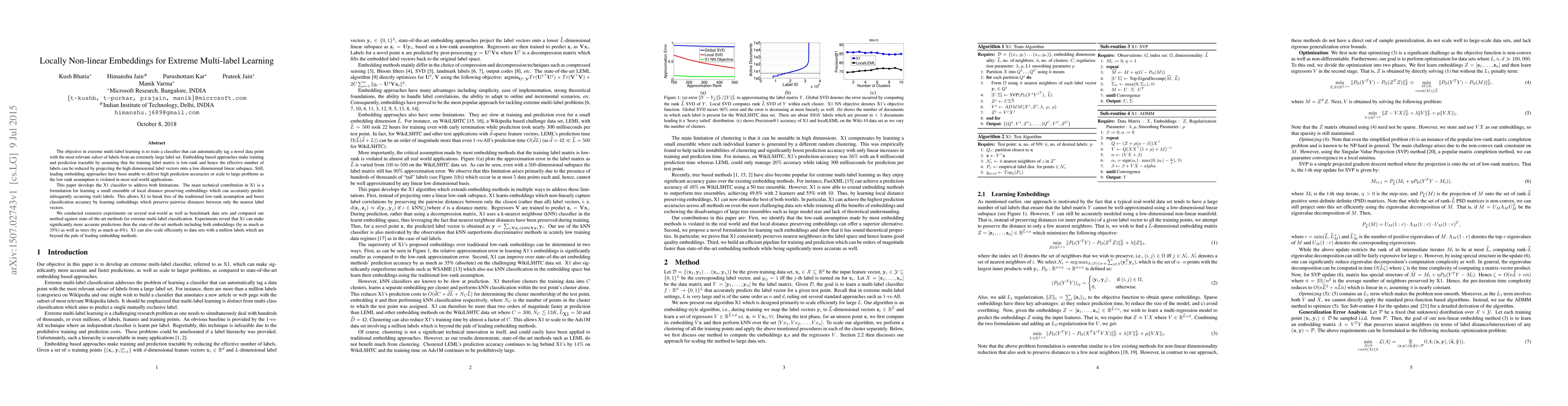 The objective in extreme multi-label learning is to train a classifier that can automatically tag a novel data point with the most relevant subset of labels from an extremely large label set. Embedding based approaches make training and prediction tractable by assuming that the training label matrix is low-rank and hence the effective number of labels can be reduced by projecting the high dimensional label vectors onto a low dimensional linear subspace. Still, leading embedding approaches have been unable to deliver high prediction accuracies or scale to large problems as the low rank assumption is violated in most real world applications. This paper develops the X-One classifier to address both limitations. The main technical contribution in X-One is a formulation for learning a small ensemble of local distance preserving embeddings which can accurately predict infrequently occurring (tail) labels. This allows X-One to break free of the traditional low-rank assumption and boost classification accuracy by learning embeddings which preserve pairwise distances between only the nearest label vectors. We conducted extensive experiments on several real-world as well as benchmark data sets and compared our method against state-of-the-art methods for extreme multi-label classification. Experiments reveal that X-One can make significantly more accurate predictions then the state-of-the-art methods including both embeddings (by as much as 35%) as well as trees (by as much as 6%). X-One can also scale efficiently to data sets with a million labels which are beyond the pale of leading embedding methods.