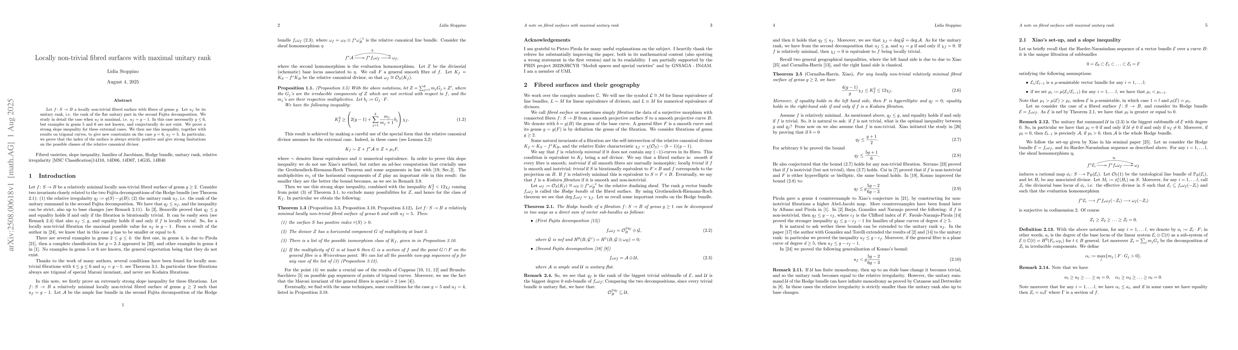 Let $f\colon S\to B$ a locally non-trivial fibred surface with fibres of genus $g$. Let $u_f$ be its unitary rank, i.e. the rank of the flat unitary part in the second Fujita decomposition. We study in detail the case when $u_f$ is maximal, i.e. $u_f=g-1$. In this case necessarily $g\leq 6$, but examples in genus $5$ and $6$ are not known, and conjecturally do not exist. We prove a strong slope inequality for these extremal cases. We then use this inequality, together with results on trigonal curves, to give new constraints on the case $g=6$, $u_f=5$. In particular, we prove that the index of the surface is always strictly positive and give strong limitations on the possible classes of the relative canonical divisor