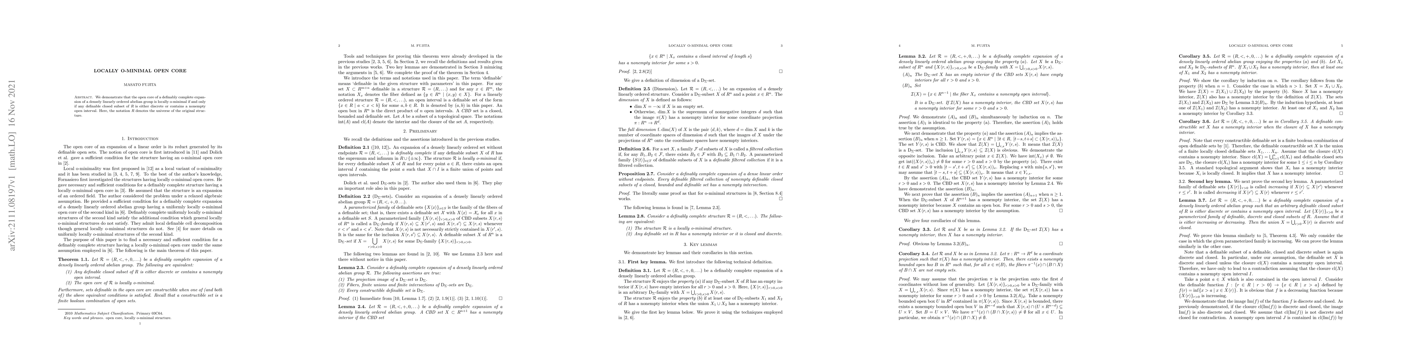 Summary: The paper proves that a definably complete expansion of a densely ordered group has a locally o-minimal open core if and only if every definable closed subset of the group is either discrete or contains a nonempty open interval. This establishes a structural condition for the open core's local o-minimality.