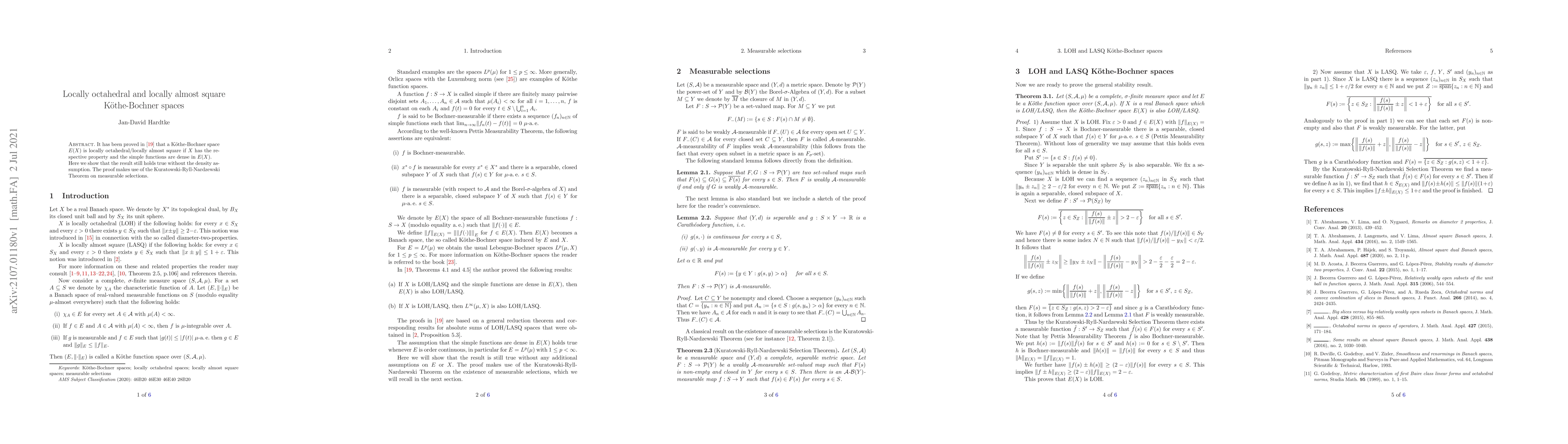 It has been proved in [J.-D. Hardtke, J. Math. Phys. Anal. Geom. 16, no.2, 119--137 (2020)] that a K\"othe-Bochner space $E(X)$ is locally octahedral/locally almost square if $X$ has the respective property and the simple functions are dense in $E(X)$. Here we show that the result still holds true without the density assumption. The proof makes use of the Kuratowski-Ryll-Nardzewski Theorem on measurable selections.