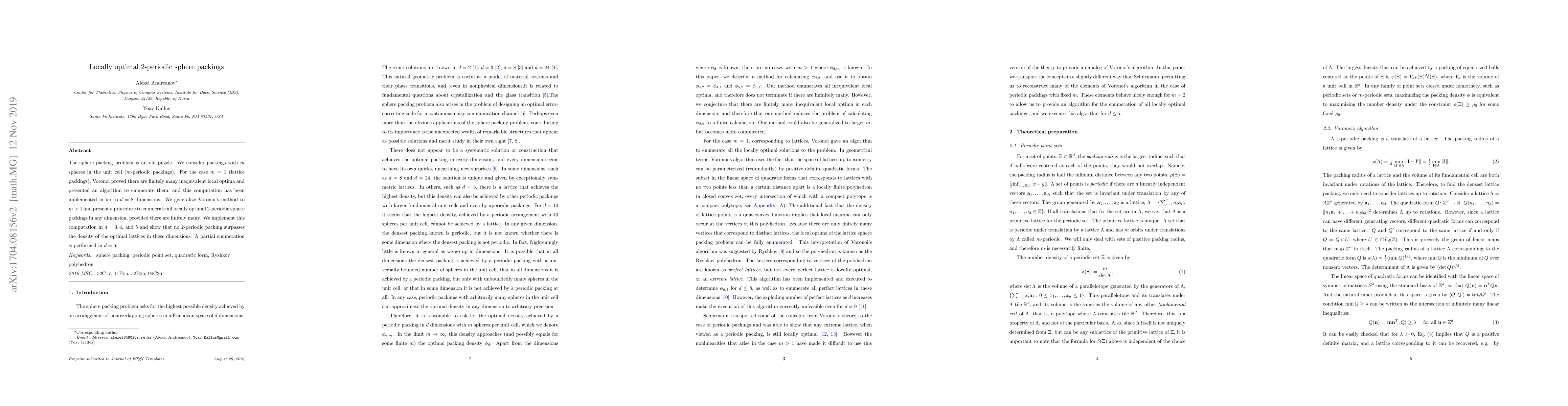 The sphere packing problem is an old puzzle. We consider packings with m spheres in the unit cell (m-periodic packings). For the case m = 1 (lattice packings), Voronoi proved there are finitely many inequivalent local optima and presented an algorithm to enumerate them, and this computation has been implemented in up to d = 8 dimensions. We generalize Voronoi's method to m > 1 and present a procedure to enumerate all locally optimal 2-periodic sphere packings in any dimension, provided there are finitely many. We implement this computation in d = 3, 4, and 5 and show that no 2-periodic packing surpasses the density of the optimal lattices in these dimensions. A partial enumeration is performed in d = 6.