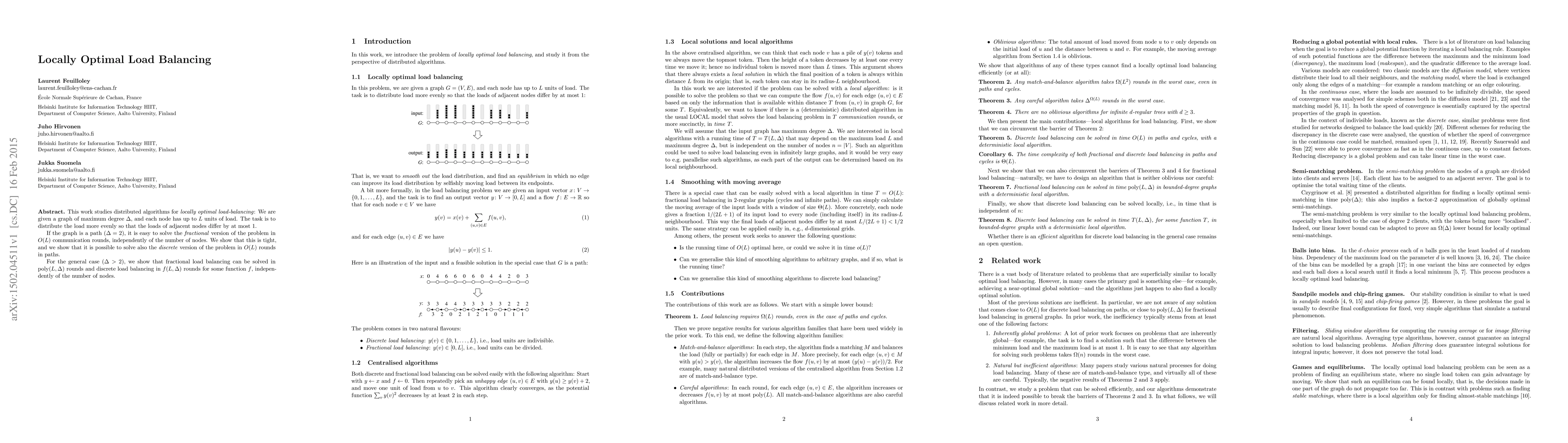 This paper investigates distributed algorithms for achieving locally optimal load balancing in graphs, demonstrating efficient solutions for paths and more complex graphs. It shows that fractional load balancing can be solved in polynomial time in general graphs, while discrete load balancing requires a function of load and maximum degree.