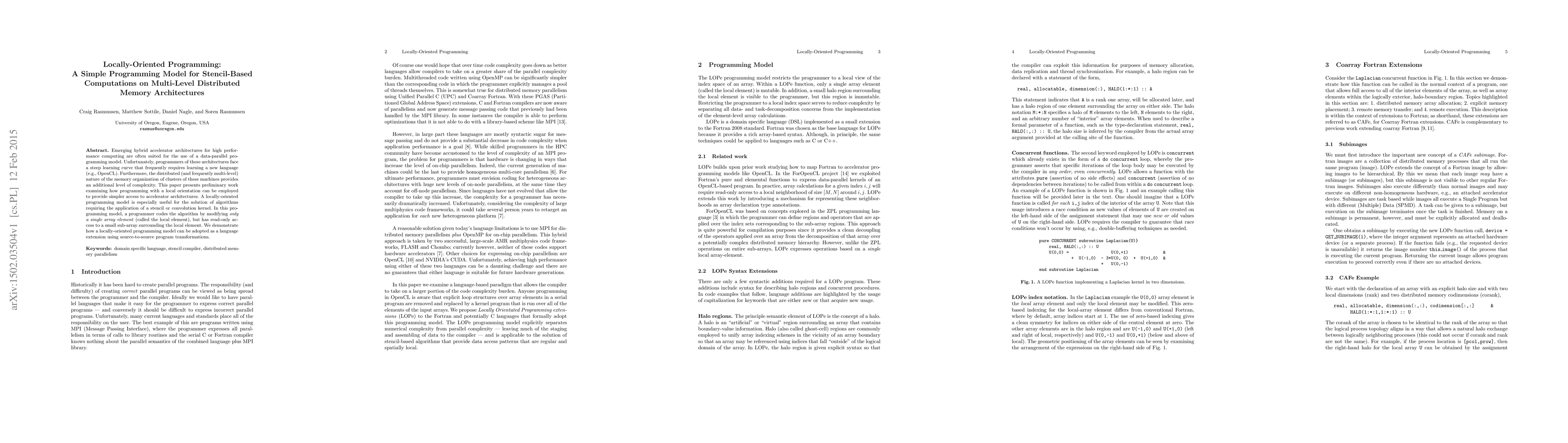 Emerging hybrid accelerator architectures for high performance computing are often suited for the use of a data-parallel programming model. Unfortunately, programmers of these architectures face a steep learning curve that frequently requires learning a new language (e.g., OpenCL). Furthermore, the distributed (and frequently multi-level) nature of the memory organization of clusters of these machines provides an additional level of complexity. This paper presents preliminary work examining how programming with a local orientation can be employed to provide simpler access to accelerator architectures. A locally-oriented programming model is especially useful for the solution of algorithms requiring the application of a stencil or convolution kernel. In this programming model, a programmer codes the algorithm by modifying only a single array element (called the local element), but has read-only access to a small sub-array surrounding the local element. We demonstrate how a locally-oriented programming model can be adopted as a language extension using source-to-source program transformations.