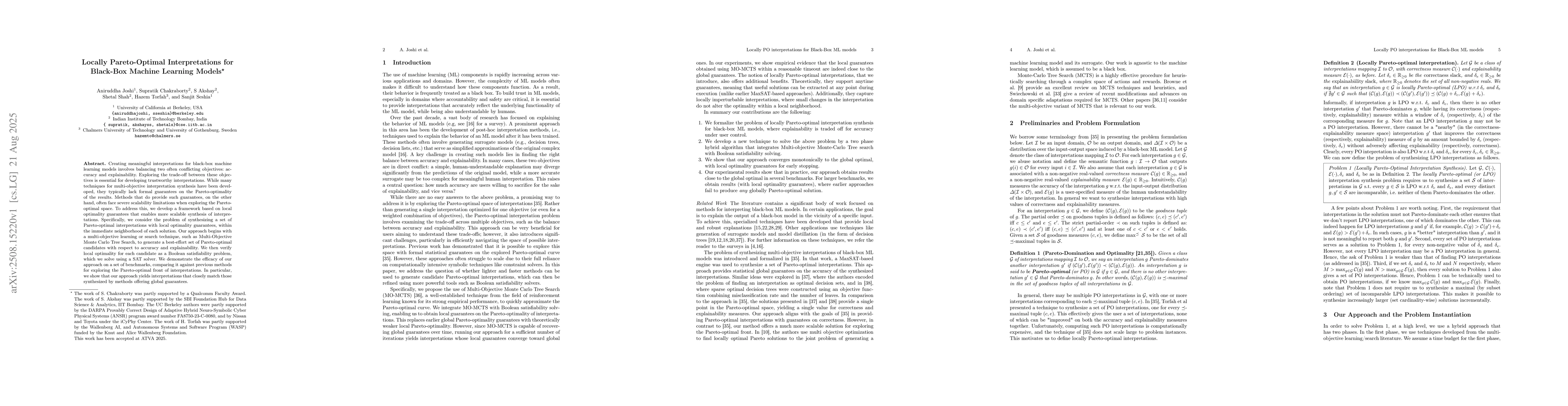 Creating meaningful interpretations for black-box machine learning models involves balancing two often conflicting objectives: accuracy and explainability. Exploring the trade-off between these objectives is essential for developing trustworthy interpretations. While many techniques for multi-objective interpretation synthesis have been developed, they typically lack formal guarantees on the Pareto-optimality of the results. Methods that do provide such guarantees, on the other hand, often face severe scalability limitations when exploring the Pareto-optimal space. To address this, we develop a framework based on local optimality guarantees that enables more scalable synthesis of interpretations. Specifically, we consider the problem of synthesizing a set of Pareto-optimal interpretations with local optimality guarantees, within the immediate neighborhood of each solution. Our approach begins with a multi-objective learning or search technique, such as Multi-Objective Monte Carlo Tree Search, to generate a best-effort set of Pareto-optimal candidates with respect to accuracy and explainability. We then verify local optimality for each candidate as a Boolean satisfiability problem, which we solve using a SAT solver. We demonstrate the efficacy of our approach on a set of benchmarks, comparing it against previous methods for exploring the Pareto-optimal front of interpretations. In particular, we show that our approach yields interpretations that closely match those synthesized by methods offering global guarantees.