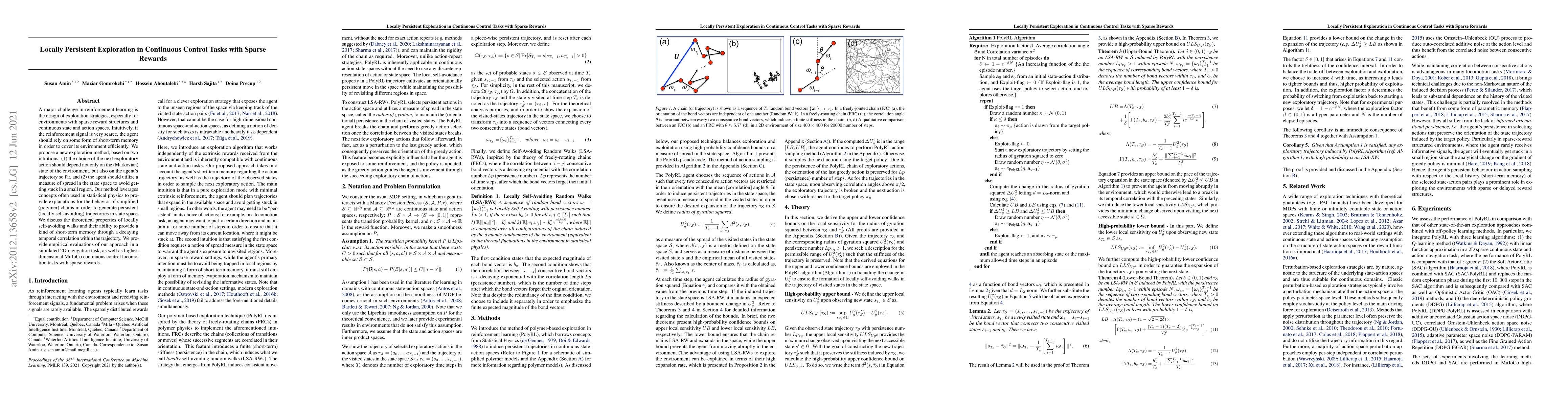 A major challenge in reinforcement learning is the design of exploration strategies, especially for environments with sparse reward structures and continuous state and action spaces. Intuitively, if the reinforcement signal is very scarce, the agent should rely on some form of short-term memory in order to cover its environment efficiently. We propose a new exploration method, based on two intuitions: (1) the choice of the next exploratory action should depend not only on the (Markovian) state of the environment, but also on the agent's trajectory so far, and (2) the agent should utilize a measure of spread in the state space to avoid getting stuck in a small region. Our method leverages concepts often used in statistical physics to provide explanations for the behavior of simplified (polymer) chains in order to generate persistent (locally self-avoiding) trajectories in state space. We discuss the theoretical properties of locally self-avoiding walks and their ability to provide a kind of short-term memory through a decaying temporal correlation within the trajectory. We provide empirical evaluations of our approach in a simulated 2D navigation task, as well as higher-dimensional MuJoCo continuous control locomotion tasks with sparse rewards.