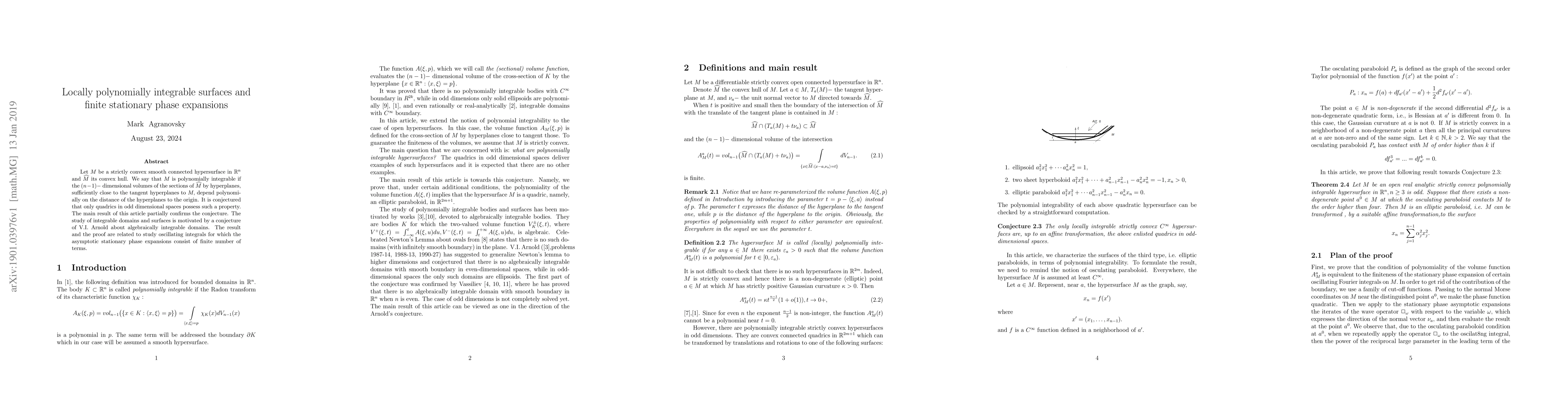 This paper investigates locally polynomially integrable surfaces, proving that strictly convex smooth hypersurfaces in odd-dimensional spaces are likely not locally polynomially integrable, thus partially confirming a conjecture. The study connects to finite stationary phase expansions of oscillating integrals.