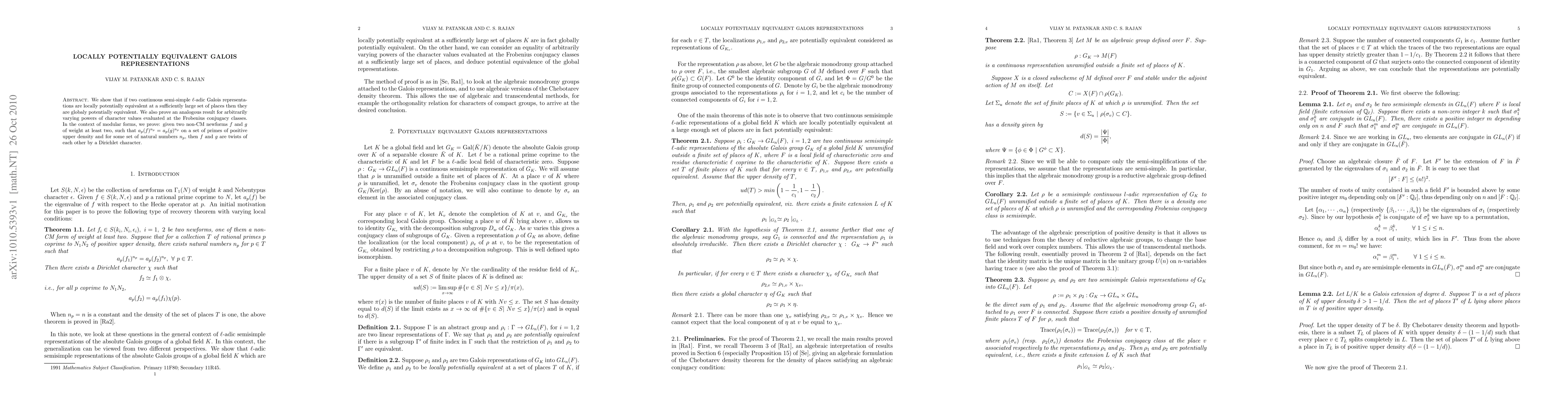 This paper demonstrates that locally potentially equivalent \(\ell\)-adic Galois representations are globally potentially equivalent on a sufficiently large set of places. Additionally, it proves an analogous result for character values evaluated at Frobenius conjugacy classes and shows that two non-CM newforms sharing specific properties on a set of primes are twists of each other by a Dirichlet character.
