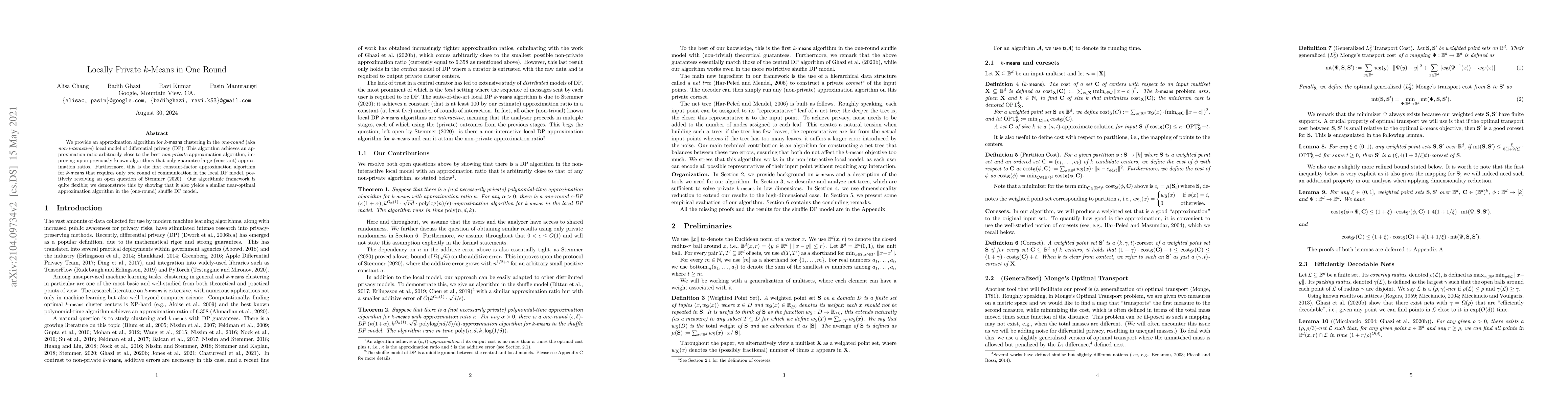 This paper introduces a one-round, locally private k-means clustering algorithm achieving near-optimal approximation ratios, significantly improving over previous methods. It resolves an open question by providing the first constant-factor approximation in a single communication round under local differential privacy, with flexibility shown in its application to the shuffle DP model.