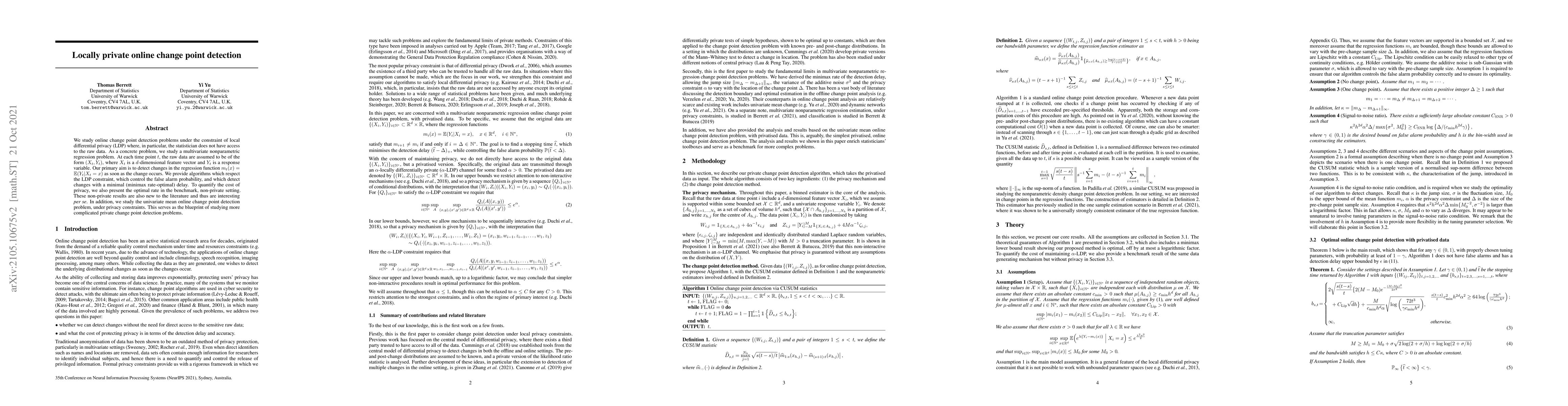 This paper develops algorithms for online change point detection under local differential privacy, focusing on multivariate nonparametric regression and univariate mean problems. The algorithms achieve optimal detection delay while controlling false alarm probability, and compare the cost of privacy with non-private benchmarks.