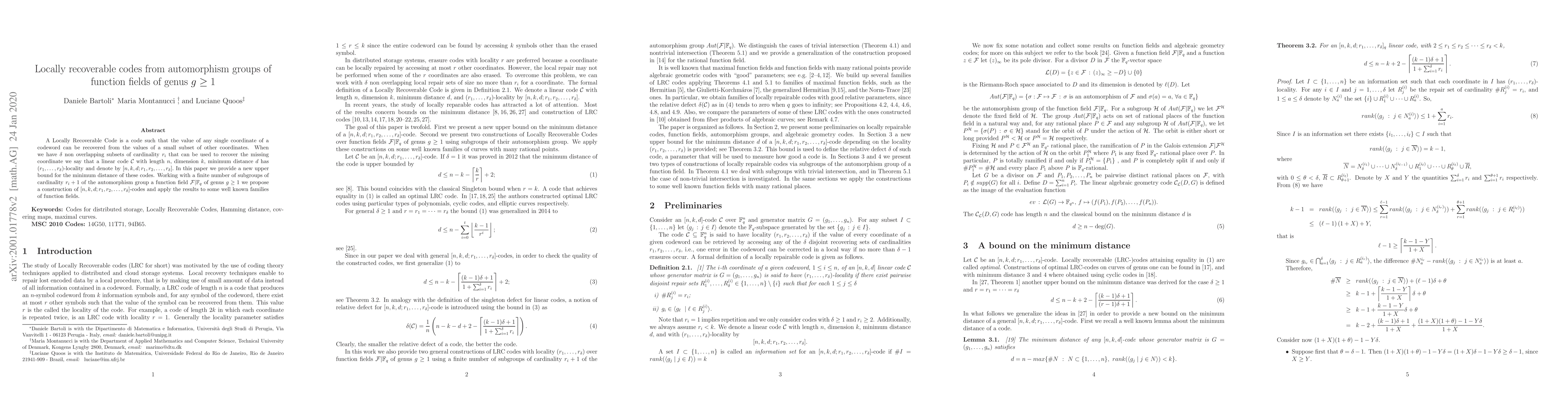 A Locally Recoverable Code is a code such that the value of any single coordinate of a codeword can be recovered from the values of a small subset of other coordinates. When we have $\delta$ non overlapping subsets of cardinality $r_i$ that can be used to recover the missing coordinate we say that a linear code $\mathcal{C}$ with length $n$, dimension $k$, minimum distance $d$ has $(r_1,\ldots, r_\delta)$-locality and denote it by $[n, k, d; r_1, r_2,\dots, r_\delta].$ In this paper we provide a new upper bound for the minimum distance of these codes. Working with a finite number of subgroups of cardinality $r_i+1$ of the automorphism group of a function field $\mathcal{F}| \mathbb{F}_q$ of genus $g \geq 1$, we propose a construction of $[n, k, d; r_1, r_2,\dots, r_\delta]$-codes and apply the results to some well known families of function fields.
