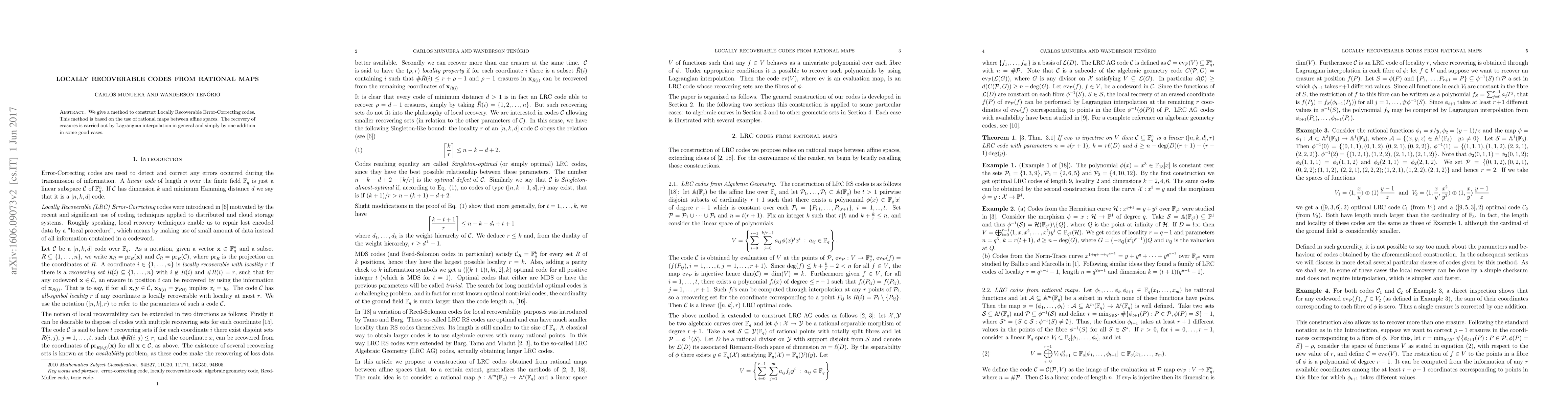 We give a method to construct Locally Recoverable Error-Correcting codes. This method is based on the use of rational maps between affine spaces. The recovery of erasures is carried out by Lagrangian interpolation in general and simply by one addition in some good cases.
