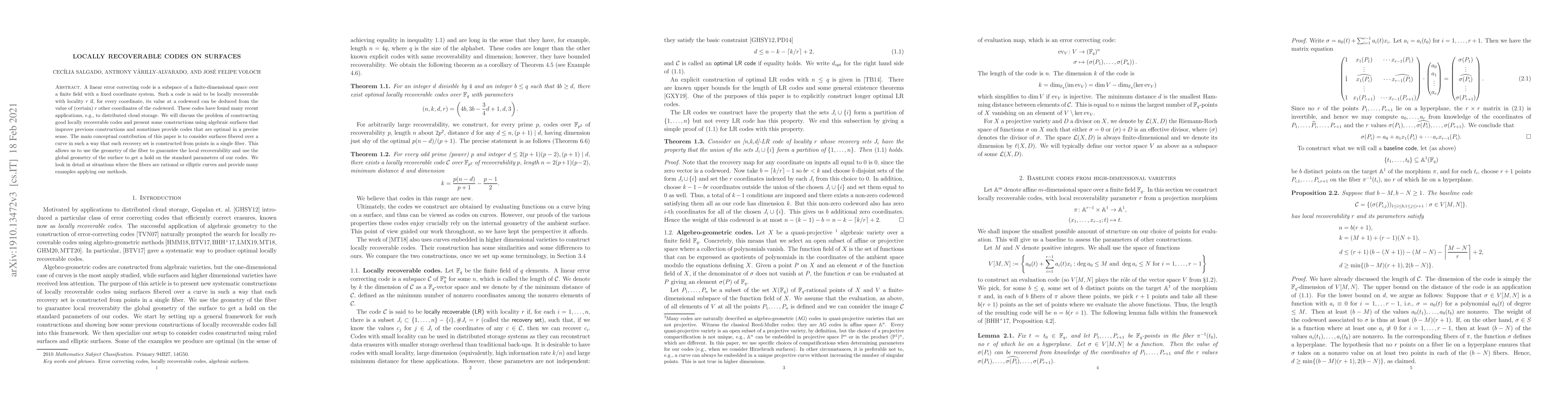 This paper explores the construction of locally recoverable codes using algebraic surfaces, improving previous methods and providing optimal codes in certain cases. The key innovation is using surfaces fibered over curves to ensure local recoverability through the geometry of individual fibers.
