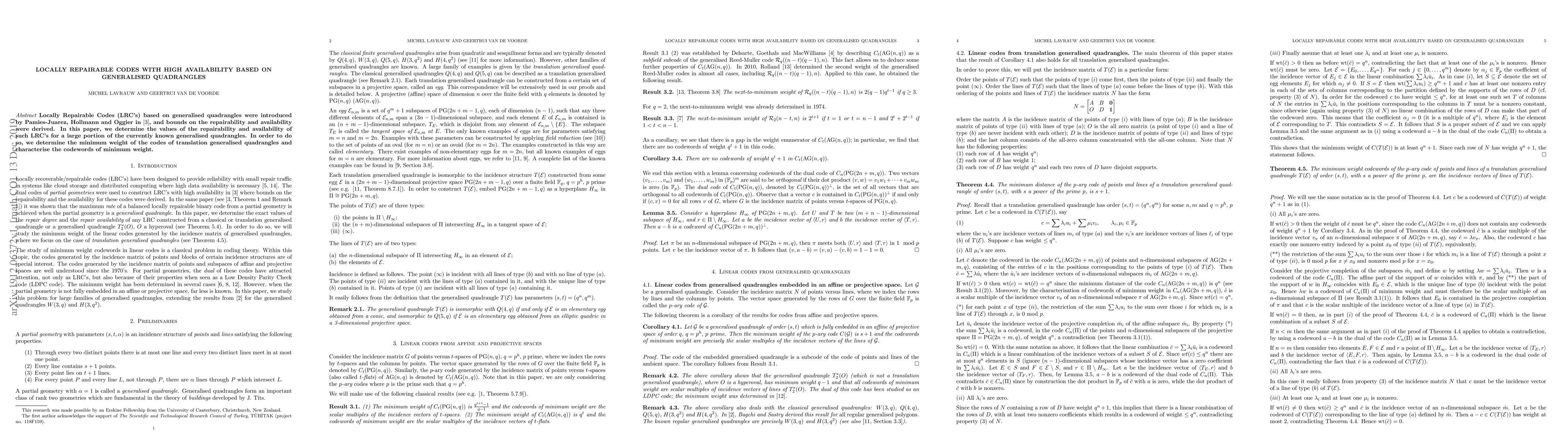This paper investigates Locally Repairable Codes (LRC) derived from generalised quadrangles, determining their repairability and availability for numerous known generalised quadrangles. It focuses on finding the minimum weight of codes from translation generalised quadrangles and identifying the properties of minimum weight codewords.