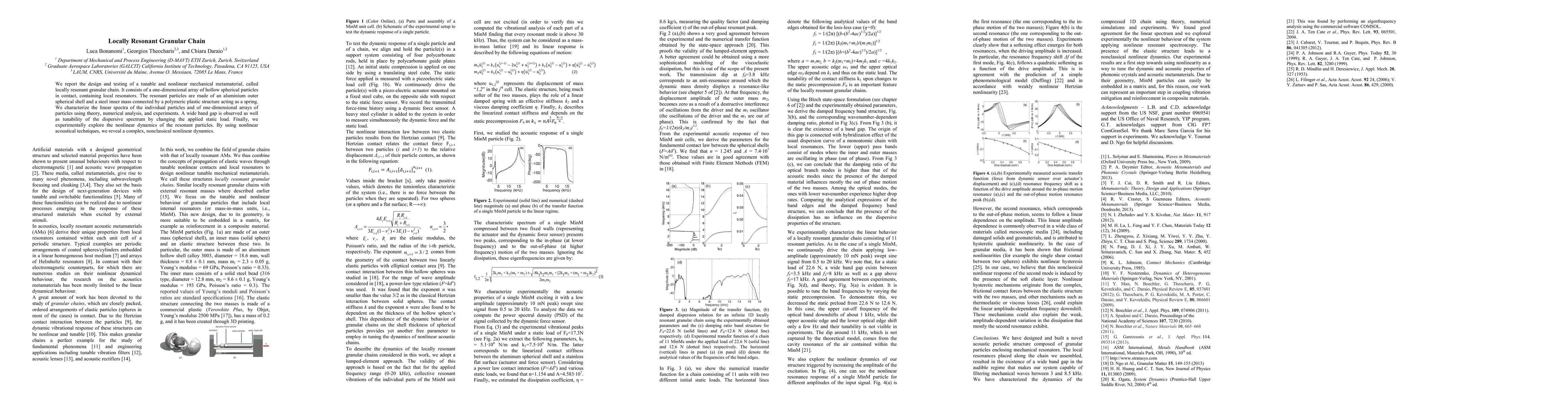 This paper details the design and testing of a tunable, nonlinear mechanical metamaterial known as a locally resonant granular chain, composed of a one-dimensional array of hollow spherical particles with local resonators. The study reveals a wide band gap and tunable dispersive spectrum, and explores the complex nonlinear dynamics using nonlinear acoustical techniques.