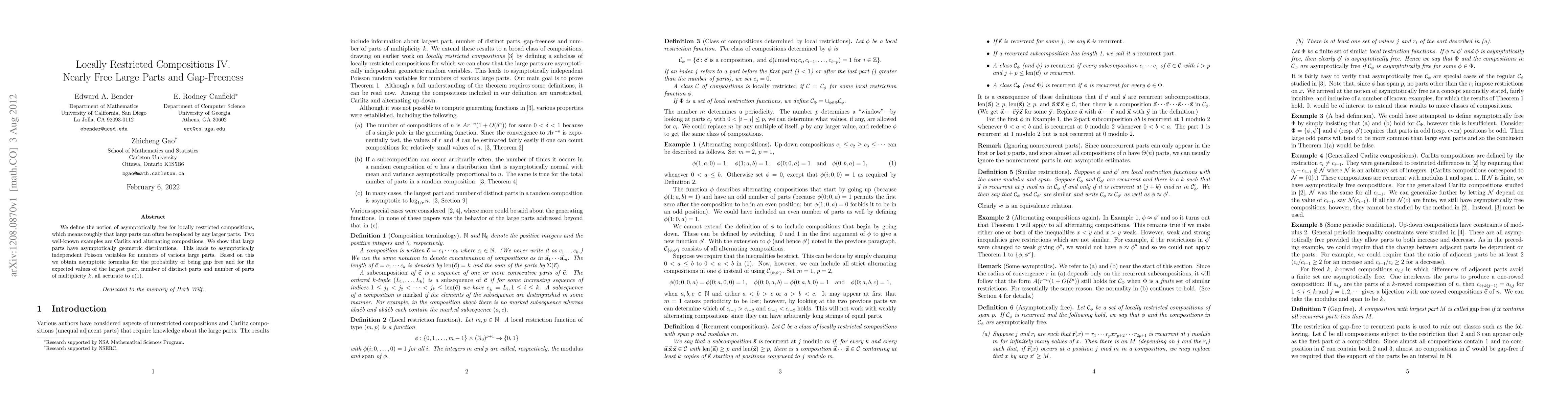 We define the notion of asymptotically free for locally restricted compositions, which means roughly that large parts can often be replaced by any larger parts. Two well-known examples are Carlitz and alternating compositions. We show that large parts have asymptotically geometric distributions. This leads to asymptotically independent Poisson variables for numbers of various large parts. Based on this we obtain asymptotic formulas for the probability of being gap free and for the expected values of the largest part, number of distinct parts and number of parts of multiplicity k, all accurate to o(1).