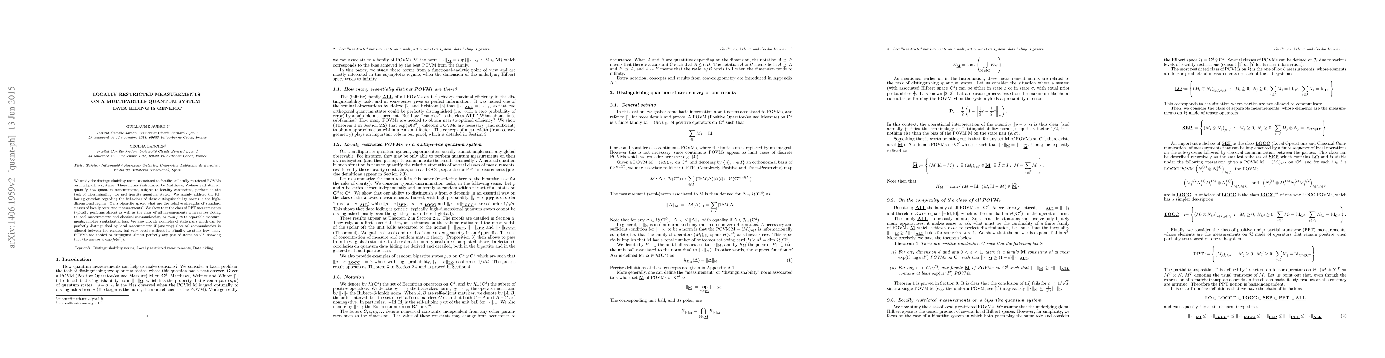 We study the distinguishability norms associated to families of locally restricted POVMs on multipartite systems. These norms (introduced by Matthews, Wehner and Winter) quantify how quantum measurements, subject to locality constraints, perform in the task of discriminating two multipartite quantum states. We mainly address the following question regarding the behaviour of these distinguishability norms in the high-dimensional regime: On a bipartite space, what are the relative strengths of standard classes of locally restricted measurements? We show that the class of PPT measurements typically performs almost as well as the class of all measurements whereas restricting to local measurements and classical communication, or even just to separable measurements, implies a substantial loss. We also provide examples of state pairs which can be perfectly distinguished by local measurements if (one-way) classical communication is allowed between the parties, but very poorly without it. Finally, we study how many POVMs are needed to distinguish almost perfectly any pair of states on $\mathbf{C}^d$, showing that the answer is $\exp(\Theta(d^2))$.