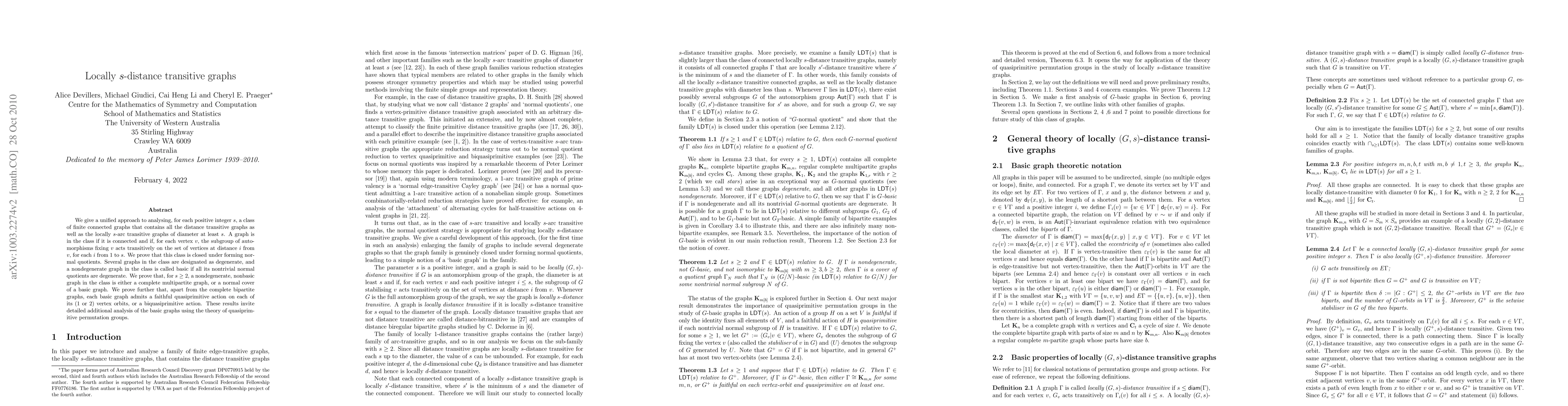 We give a unified approach to analysing, for each positive integer $s$, a class of finite connected graphs that contains all the distance transitive graphs as well as the locally $s$-arc transitive graphs of diameter at least $s$. A graph is in the class if it is connected and if, for each vertex $v$, the subgroup of automorphisms fixing $v$ acts transitively on the set of vertices at distance $i$ from $v$, for each $i$ from 1 to $s$. We prove that this class is closed under forming normal quotients. Several graphs in the class are designated as degenerate, and a nondegenerate graph in the class is called basic if all its nontrivial normal quotients are degenerate. We prove that, for $s\geq 2$, a nondegenerate, nonbasic graph in the class is either a complete multipartite graph, or a normal cover of a basic graph. We prove further that, apart from the complete bipartite graphs, each basic graph admits a faithful quasiprimitive action on each of its (1 or 2) vertex orbits, or a biquasiprimitive action. These results invite detailed additional analysis of the basic graphs using the theory of quasiprimitive permutation groups.
