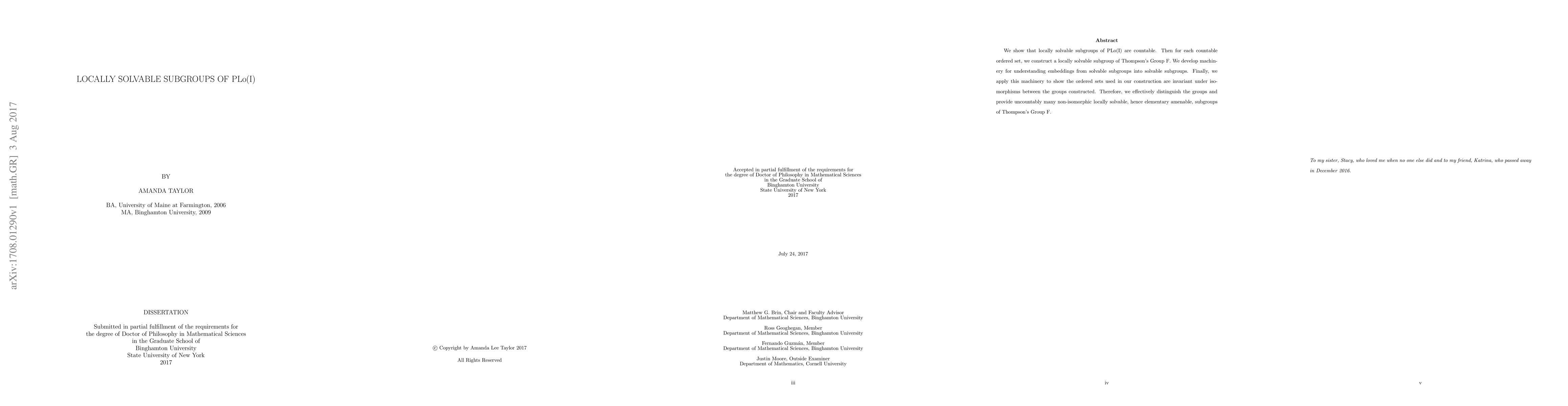 This paper demonstrates that locally solvable subgroups of PLo(I) are countable and constructs countable locally solvable subgroups of Thompson's Group F for each countable ordered set. It further develops methods to understand embeddings between solvable subgroups and uses these to show the invariance of the ordered sets under group isomorphisms, ultimately distinguishing the groups and yielding uncountably many non-isomorphic locally solvable subgroups of Thompson's Group F.