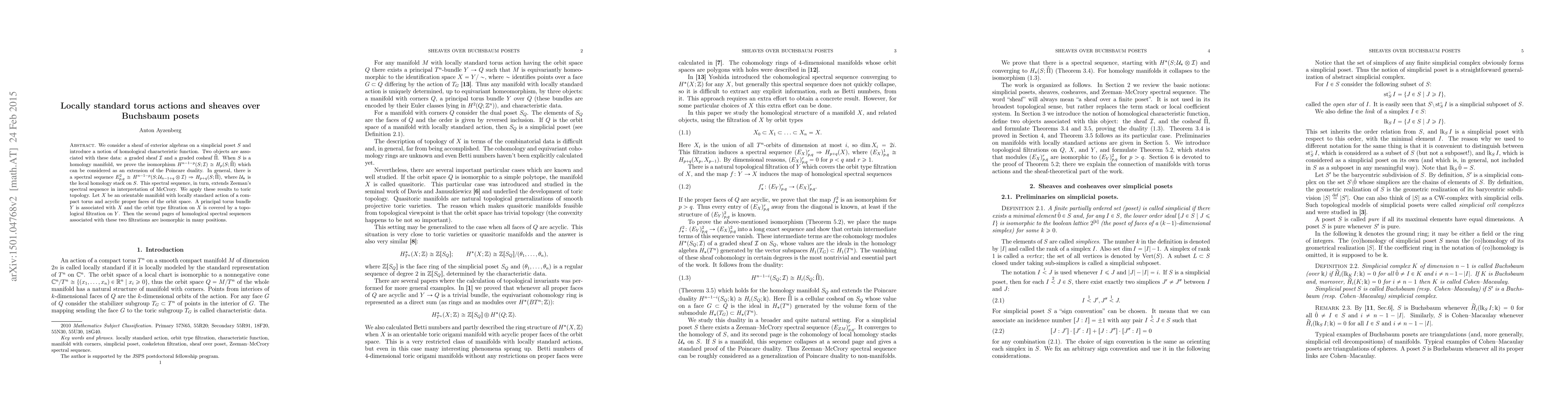 We consider a sheaf of exterior algebras on a simplicial poset $S$ and introduce a notion of homological characteristic function. Two natural objects are associated with these data: a graded sheaf $\mathcal{I}$ and a graded cosheaf $\widehat{\Pi}$. When $S$ is a homology manifold, we prove the isomorphism $H^{n-1-p}(S;\mathcal{I})\cong H_{p}(S;\widehat{\Pi})$ which can be considered as an extension of the Poincare duality. In general, there is a spectral sequence $E^2_{p,q}\cong H^{n-1-p}(S;\mathcal{U}_{n-1+q}\otimes \mathcal{I})\Rightarrow H_{p+q}(S;\widehat{\Pi})$, where $\mathcal{U}_*$ is the local homology stack on $S$. This spectral sequence, in turn, extends Zeeman--McCrory spectral sequence. This sheaf-theoretical result is applied to toric topology. We consider a manifold $X$ with a locally standard action of a compact torus and acyclic proper faces of the orbit space. A principal torus bundle $Y$ is associated with $X$, so that $X\cong Y/\sim$. The orbit type filtration on $X$ is covered by the topological filtration on $Y$. We prove that homological spectral sequences associated with these two filtrations are isomorphic in many nontrivial positions.
