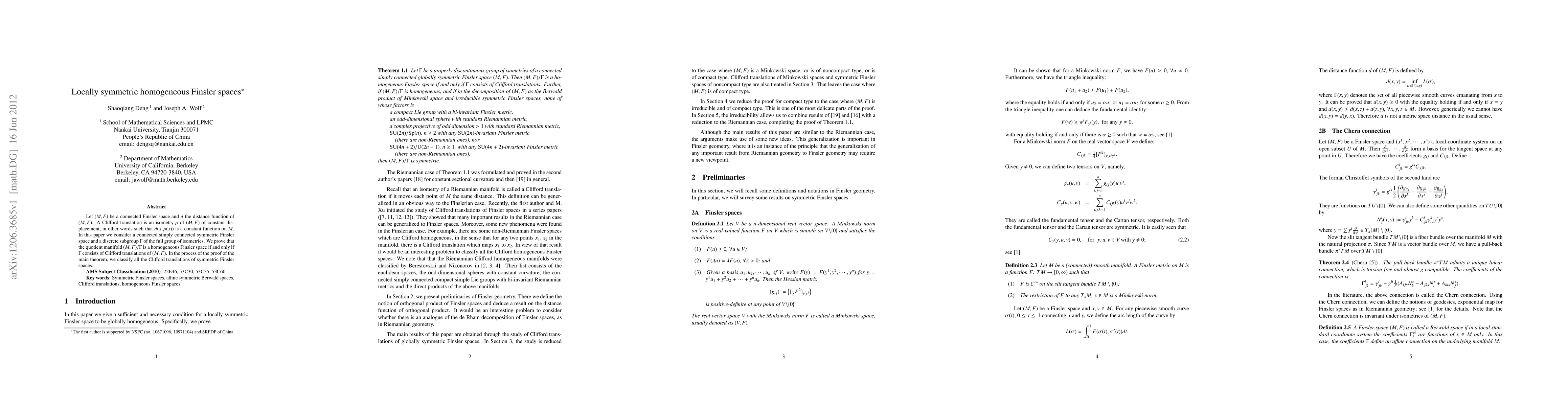 Let $(M,F)$ be a connected Finsler space and $d$ the distance function of $(M,F)$. A Clifford translation is an isometry $\rho$ of $(M,F)$ of constant displacement, in other words such that $d(x,\rho(x))$ is a constant function on $M$. In this paper we consider a connected simply connected symmetric Finsler space and a discrete subgroup $\Gamma$ of the full group of isometries. We prove that the quotient manifold $(M, F)/\Gamma$ is a homogeneous Finsler space if and only if $\Gamma$ consists of Clifford translations of $(M,F)$. In the process of the proof of the main theorem, we classify all the Clifford translations of symmetric Finsler spaces.