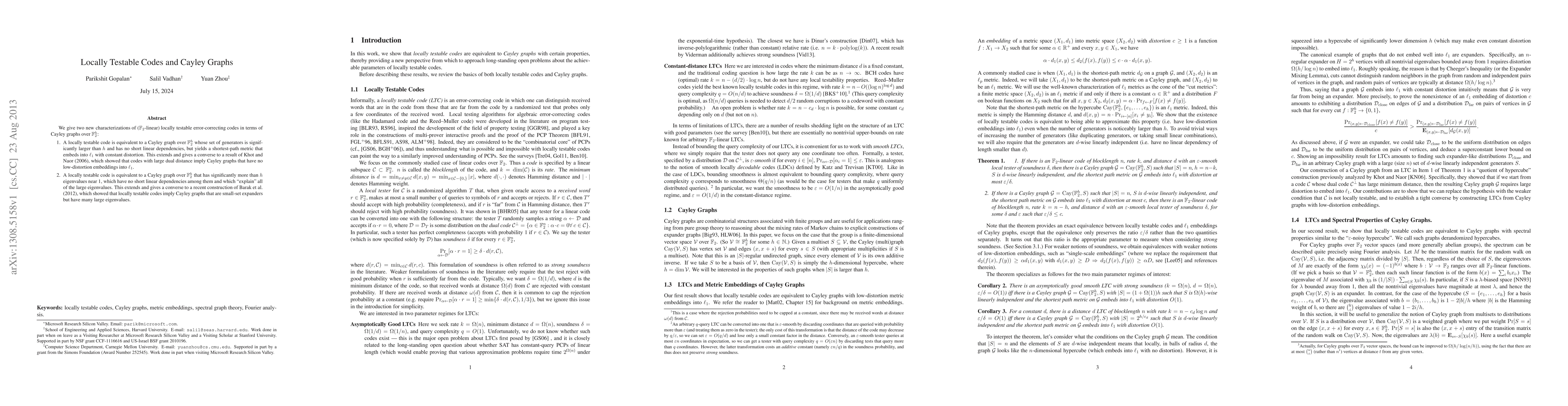 This paper characterizes ($\F_2$-linear) locally testable error-correcting codes via Cayley graphs over $\F_2^h$: codes correspond to Cayley graphs with large generator sets that embed into $\ell_1$ with constant distortion, and also to Cayley graphs with many eigenvalues near 1 explaining the large eigenvalues.