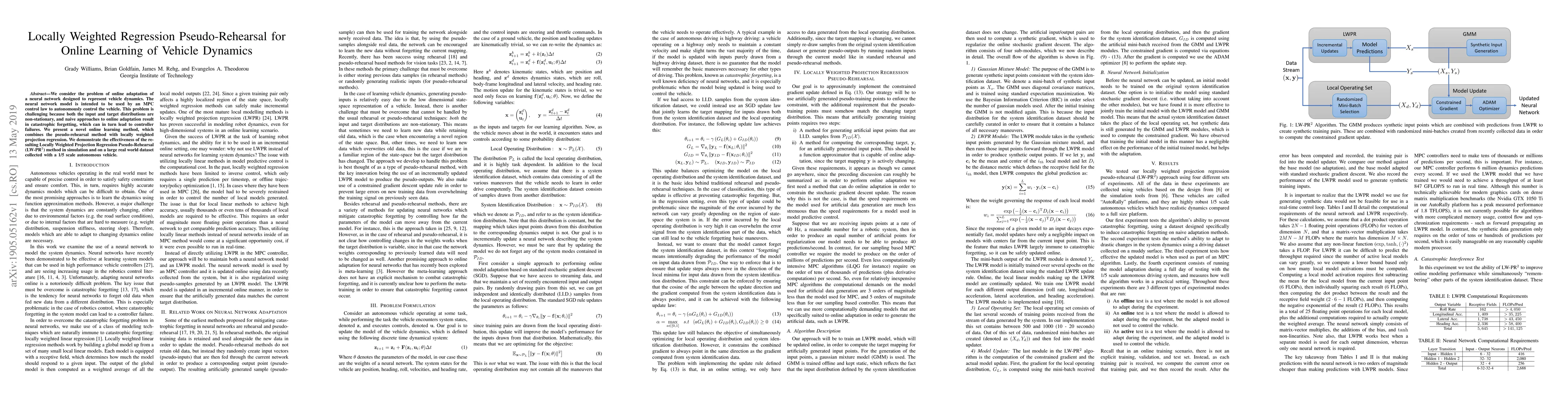 We consider the problem of online adaptation of a neural network designed to represent vehicle dynamics. The neural network model is intended to be used by an MPC control law to autonomously control the vehicle. This problem is challenging because both the input and target distributions are non-stationary, and naive approaches to online adaptation result in catastrophic forgetting, which can in turn lead to controller failures. We present a novel online learning method, which combines the pseudo-rehearsal method with locally weighted projection regression. We demonstrate the effectiveness of the resulting Locally Weighted Projection Regression Pseudo-Rehearsal (LW-PR$^2$) method in simulation and on a large real world dataset collected with a 1/5 scale autonomous vehicle.